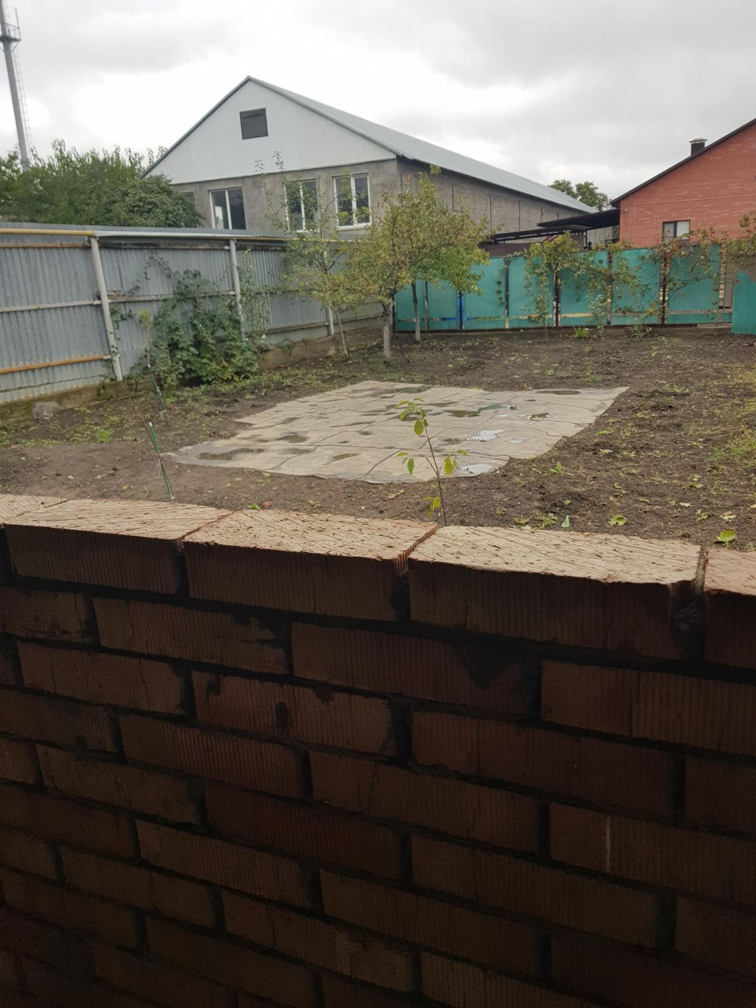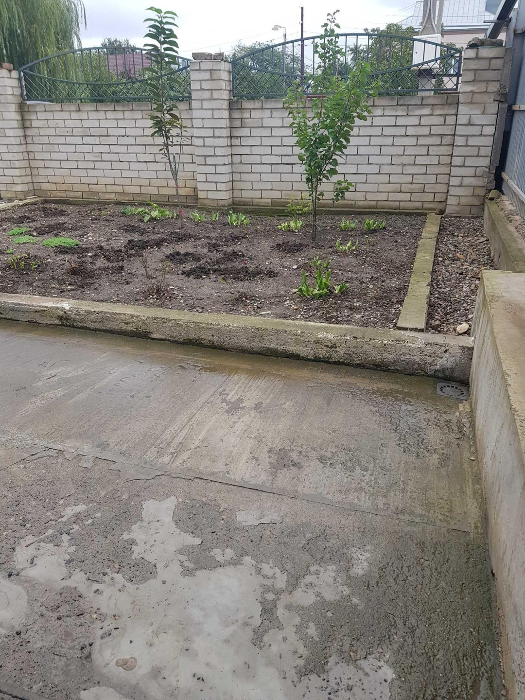 Двор забетонирован, навес, терасса, небольшой сад (посажено 8 новых деревьев) с огородом.