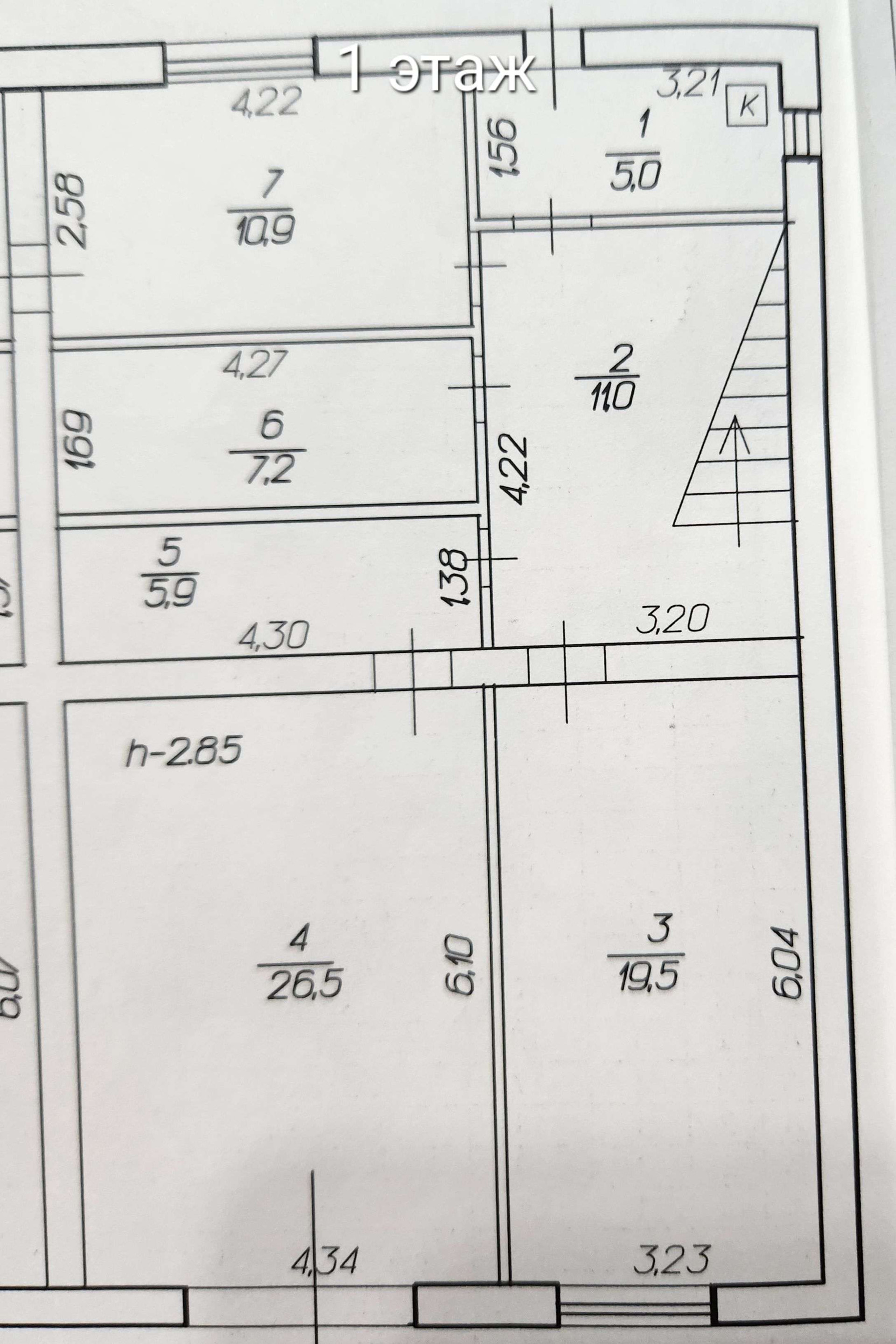 1 этаж: кухня-гостинная 19,5 кв.м., комната для гостей (спальня), с/у совмещенный, кладовая комната 5,9 кв.м, холл, коридор и гараж 26,5 кв.м. (отапливаемый);
