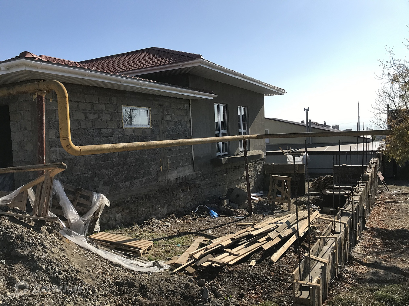 Дом построен из 32 блока с утеплением. Фасад отделам мраморной штукатуркой, декоративными элементами и диким камнем.