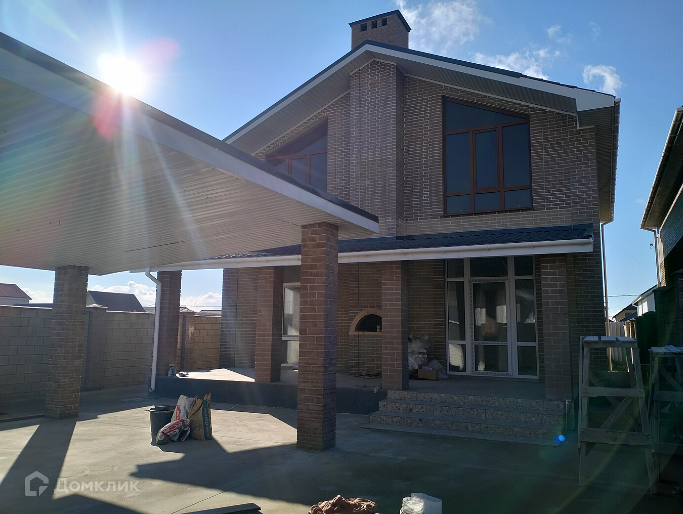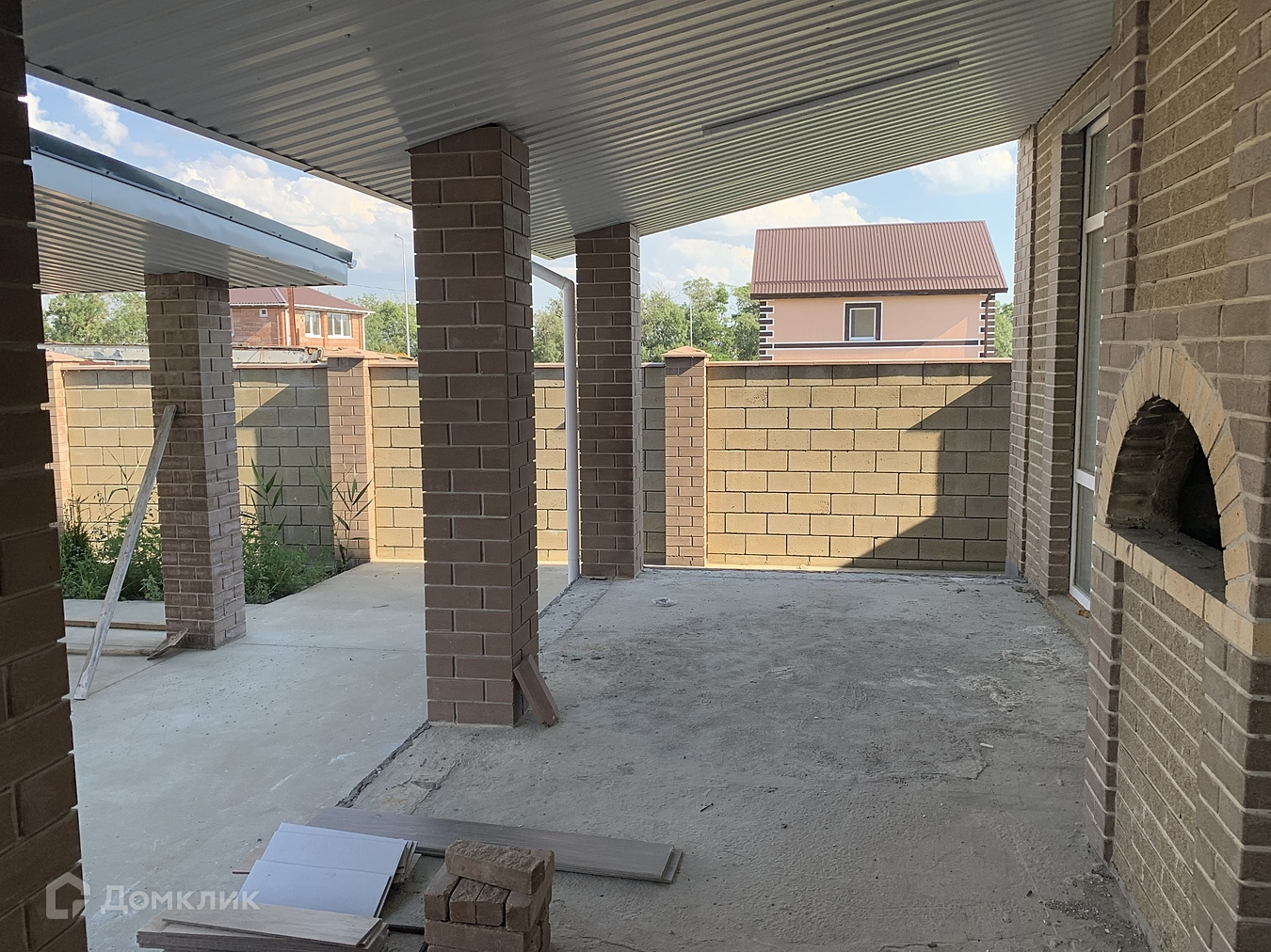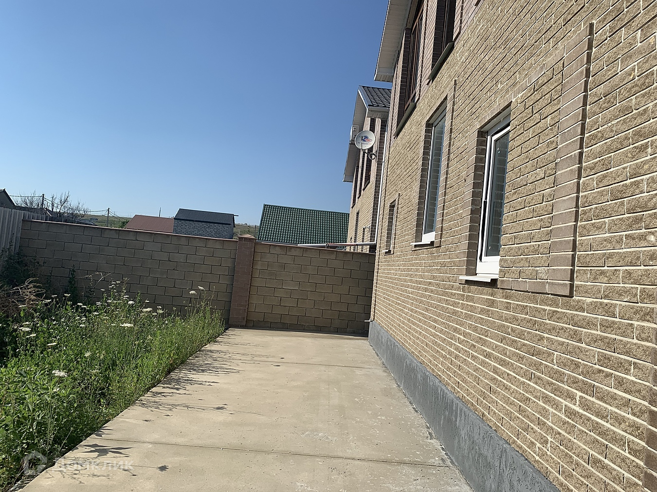 Во дворе — площадка выложена плиткой, большой навес .                                        Участок сухой, не топит.