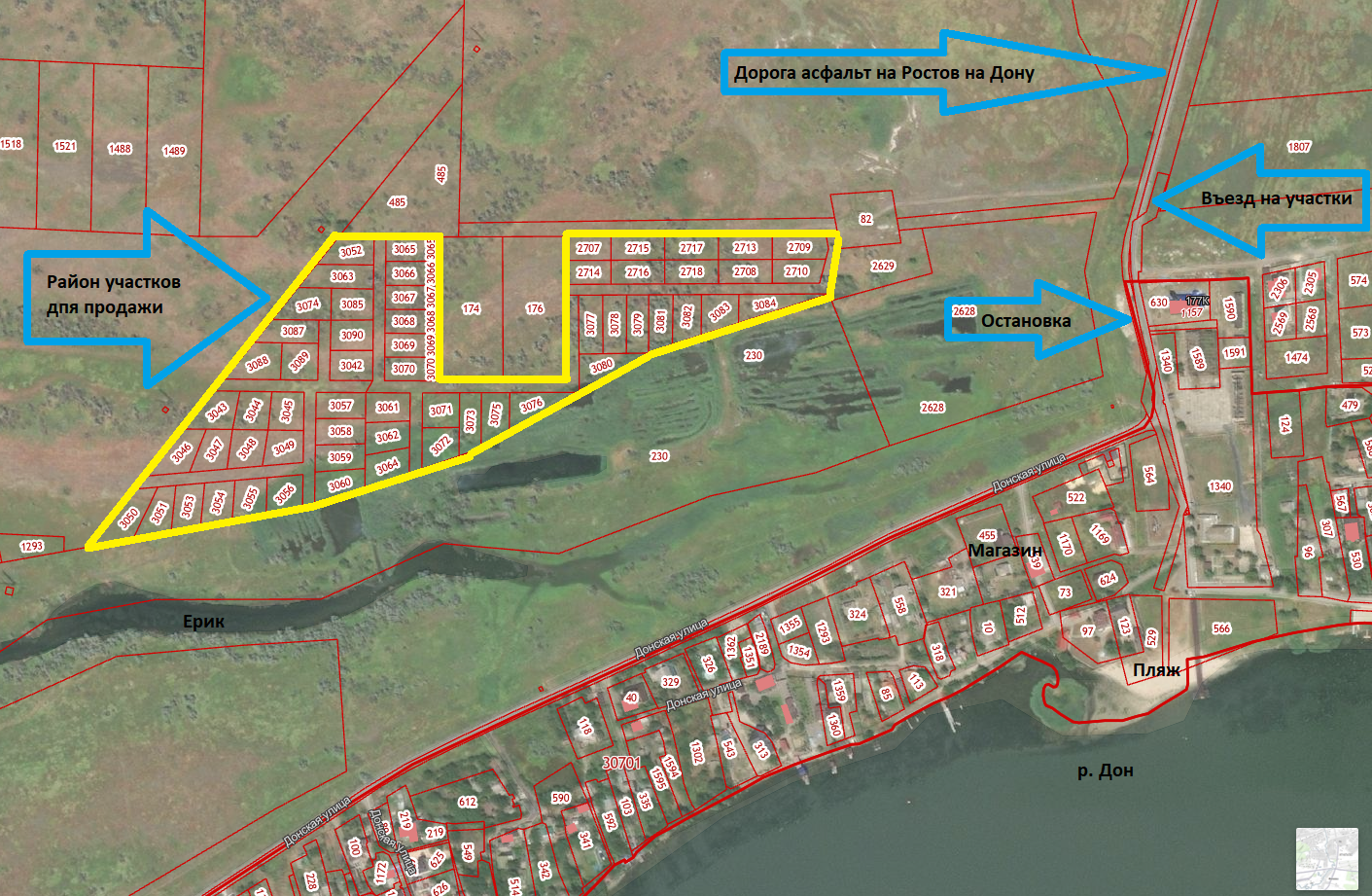 Участки находятся вдали от трассы. Остановка муниципального транспорта до ГПЗ 10, магазин, пляж реки Дон находятся рядом. Есть земельные участки с электричеством.