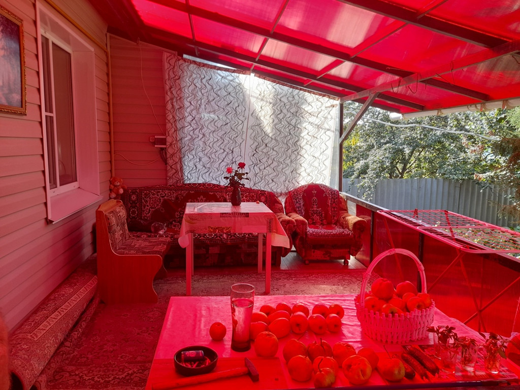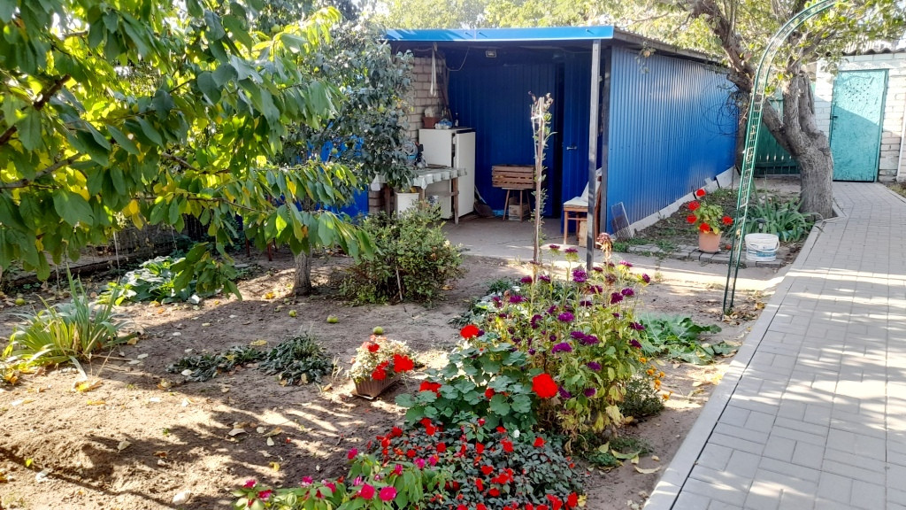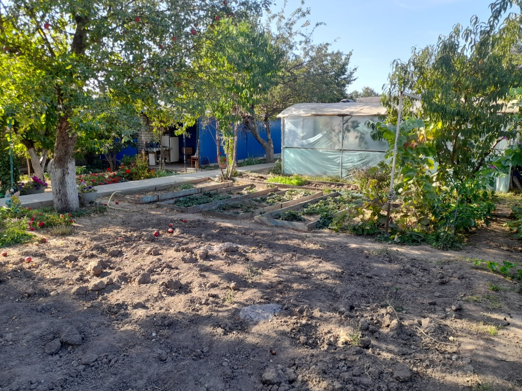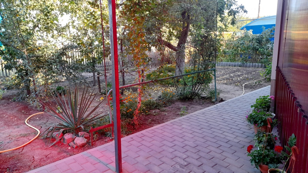 На участке много плодовых деревьев: айва, яблоня, груша, 2 персика, черемуха; кустарники: малина, смородина, а также виноград и много роз.