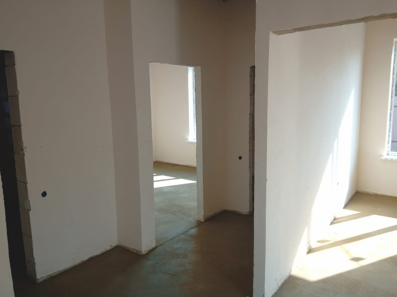 Стяжка над теплыми полами уже залита. В доме просторная кухня - гостинная, большие светлые спальни. Простая и удобная планировка.