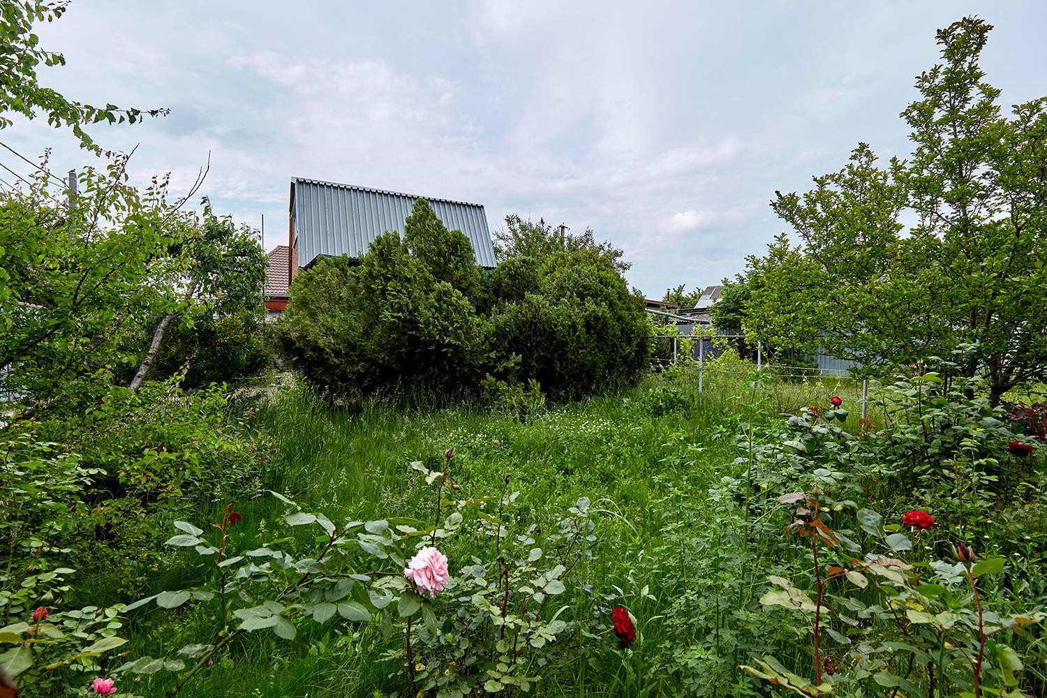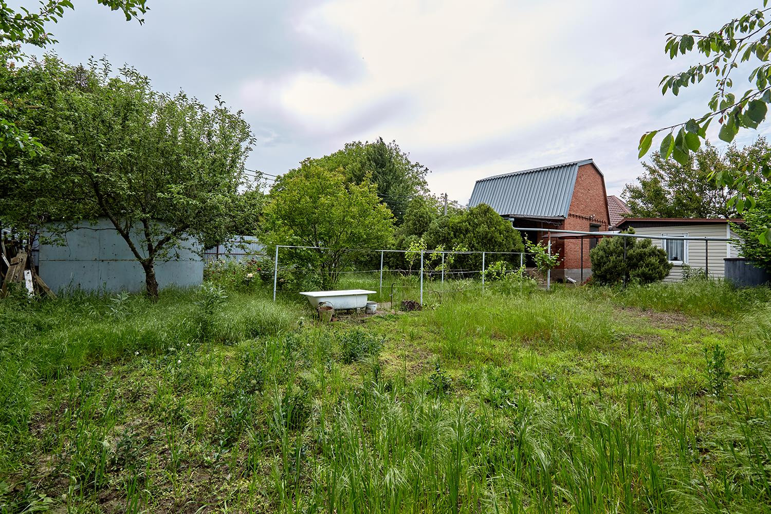 На участке растут фруктовые деревья, кустарники, виноград. Двор - декоративные кустарники.