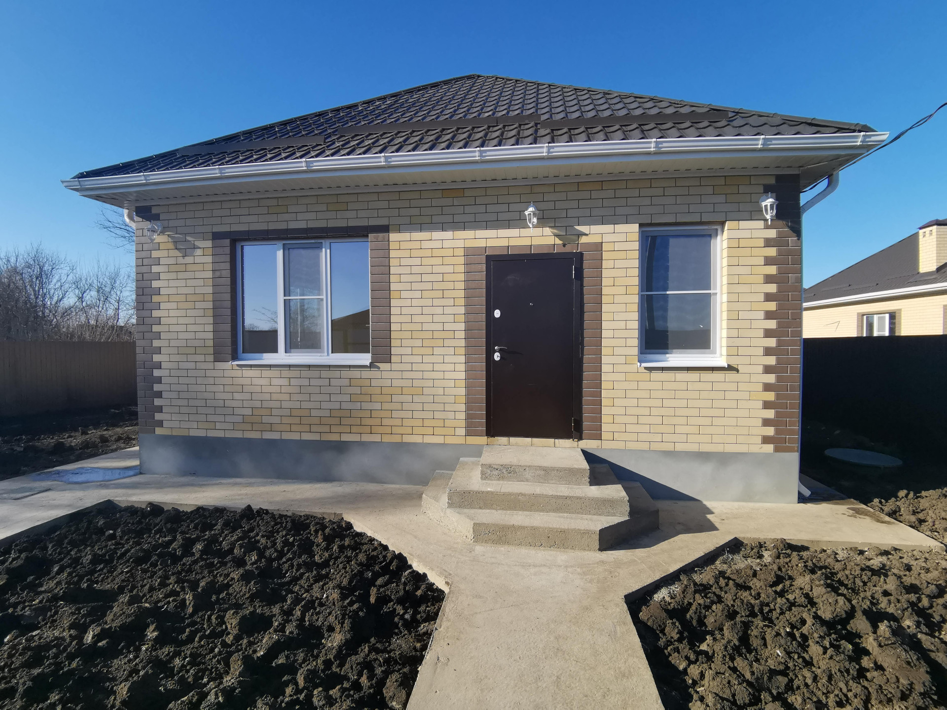 Во дворе чернозем. Участок  ровный, огорожен забором по периметру. Забетонировано парковочное место.