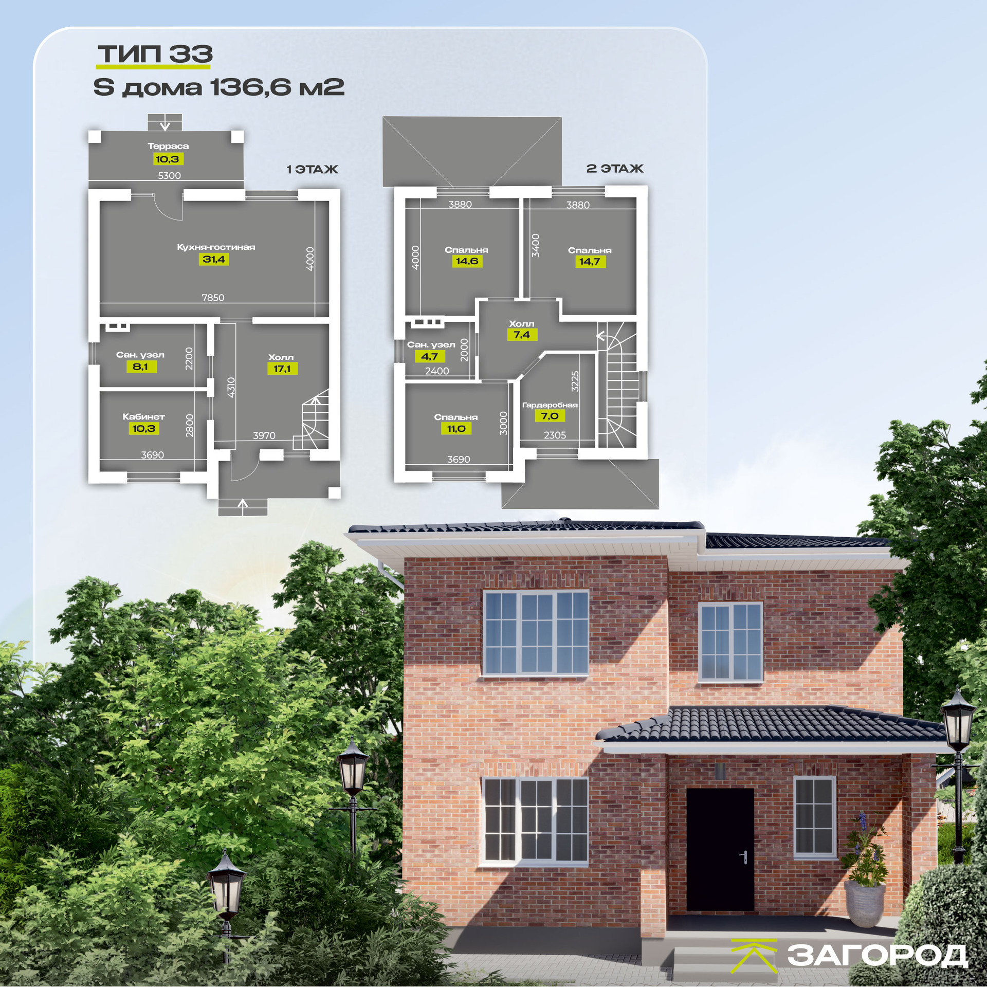Планировка: в доме два этажа, на первом этаже: большой холл – 17,1м2, кабинет – 10,3м2, санузел первого этажа – 8,1м2, кухня -гостиная – 31,4м2. На втором три спальни от 11 до 14 м2, санузел второго этажа – 4,7 м2, отдельная гардеробная – 7,9м2.