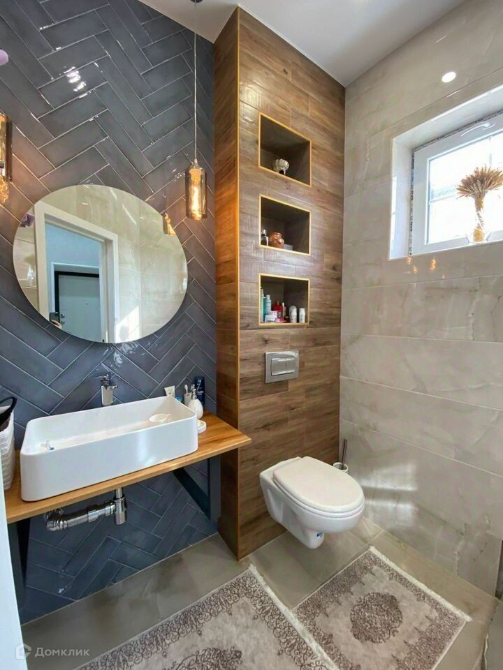 Ремонт в санузлах выполнен с использованием современных материалов и дизайнерских решений.