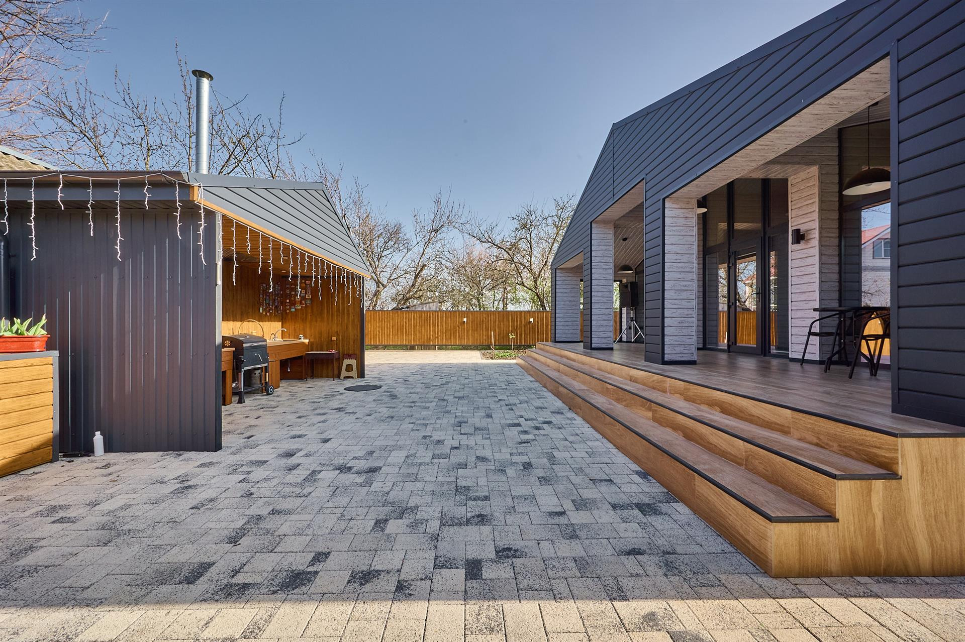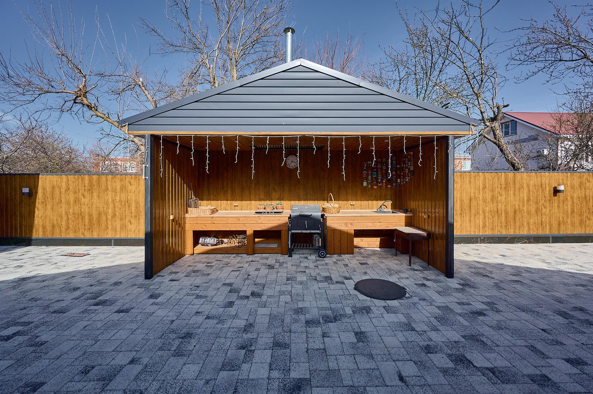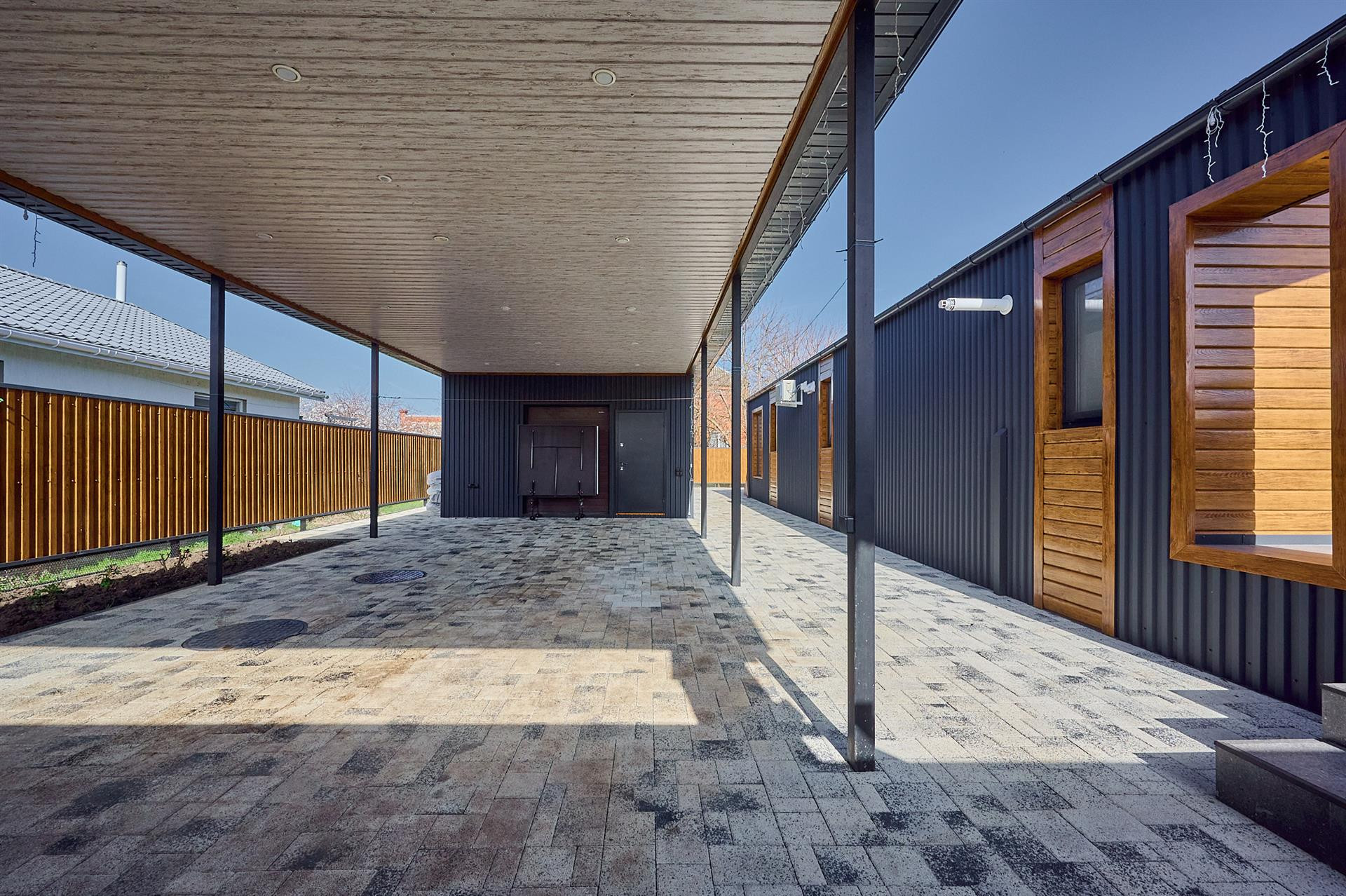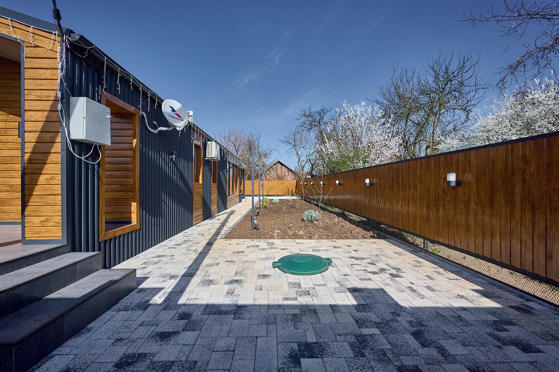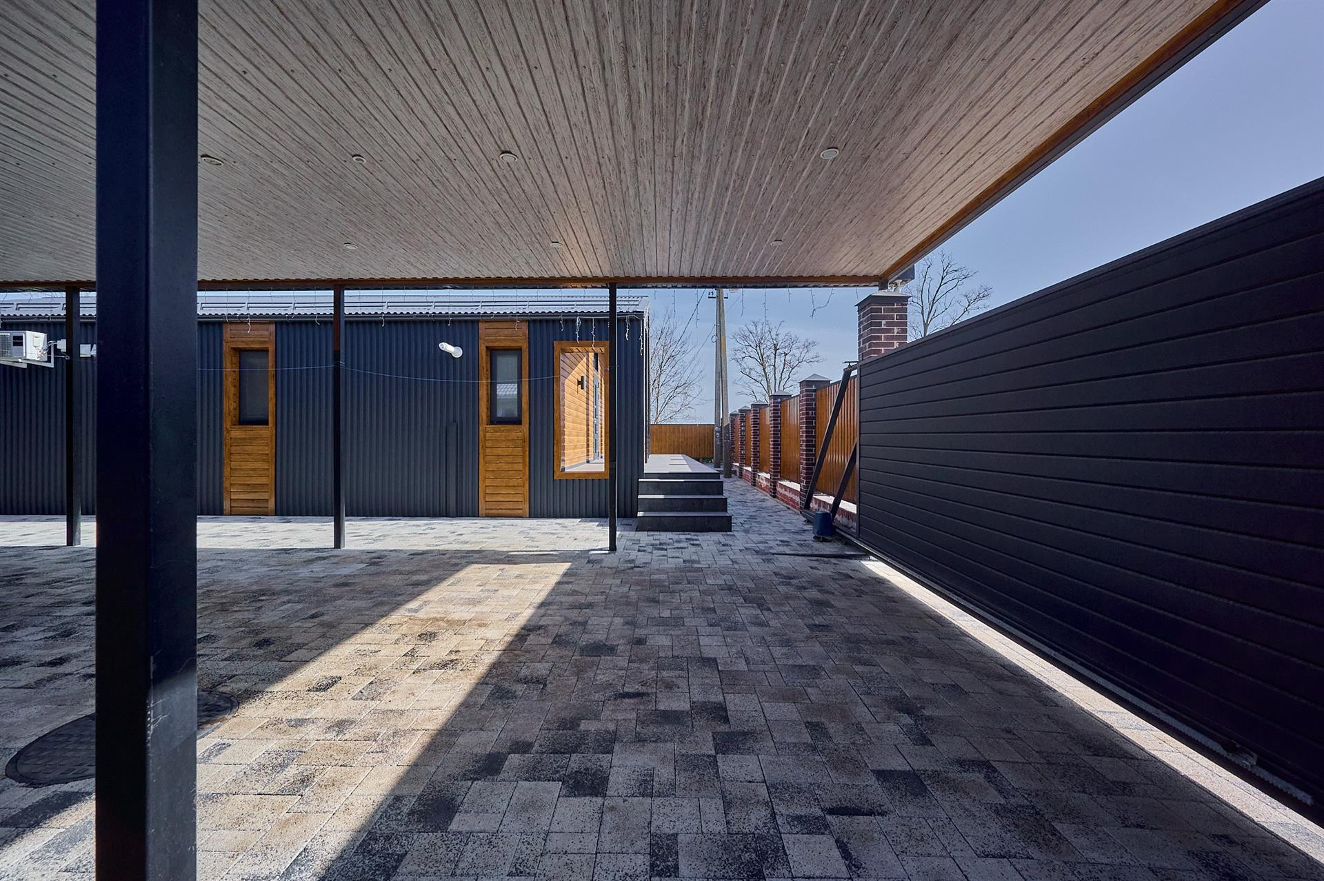 Двор весь в плитке вмещает 4 авто ,датчики света, датчики движения.