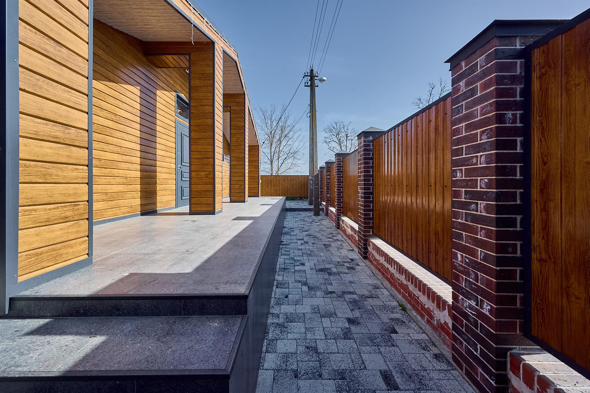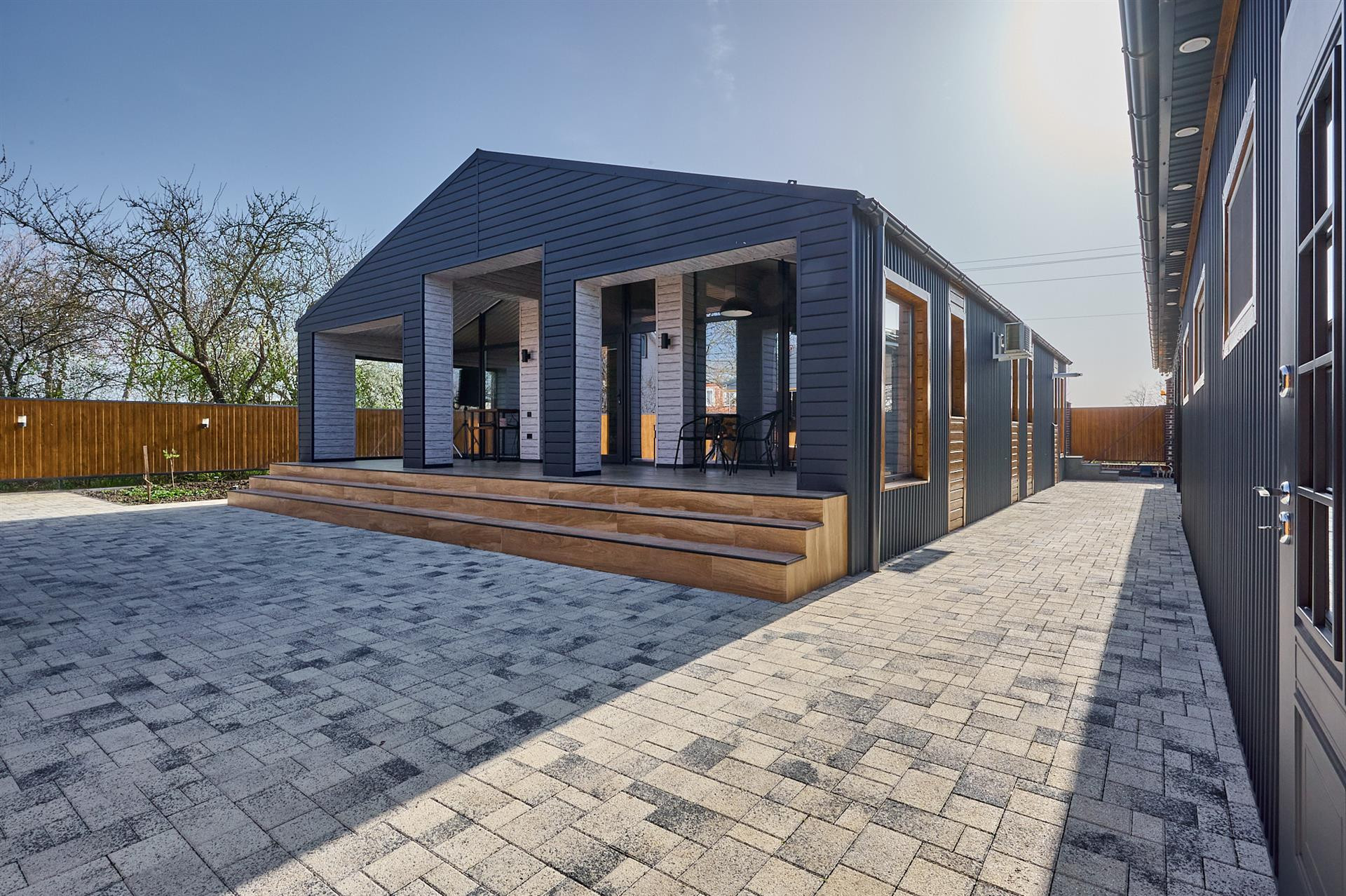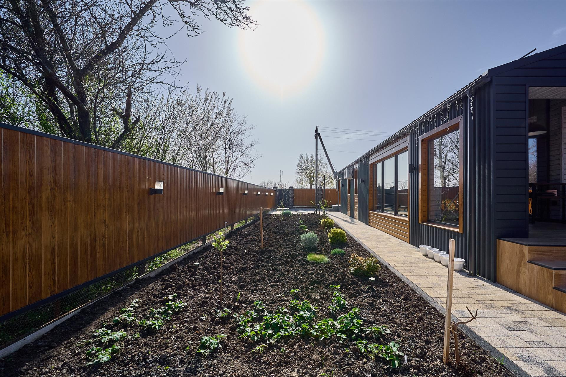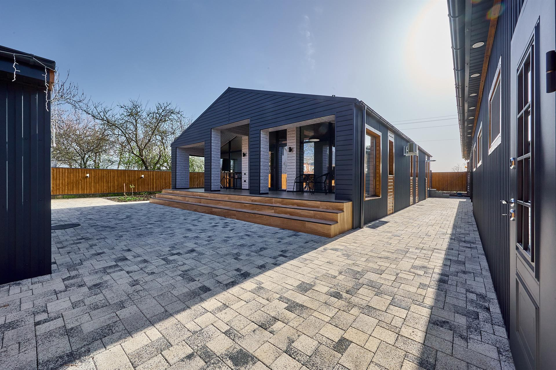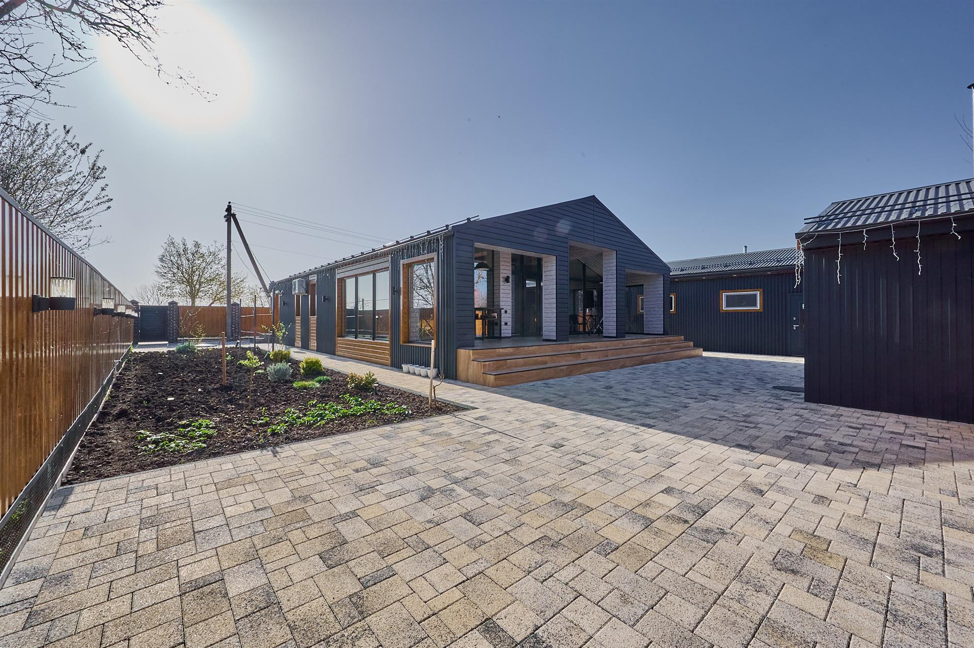 Двор весь в плитке вмещает 4 авто ,датчики света, датчики движения.