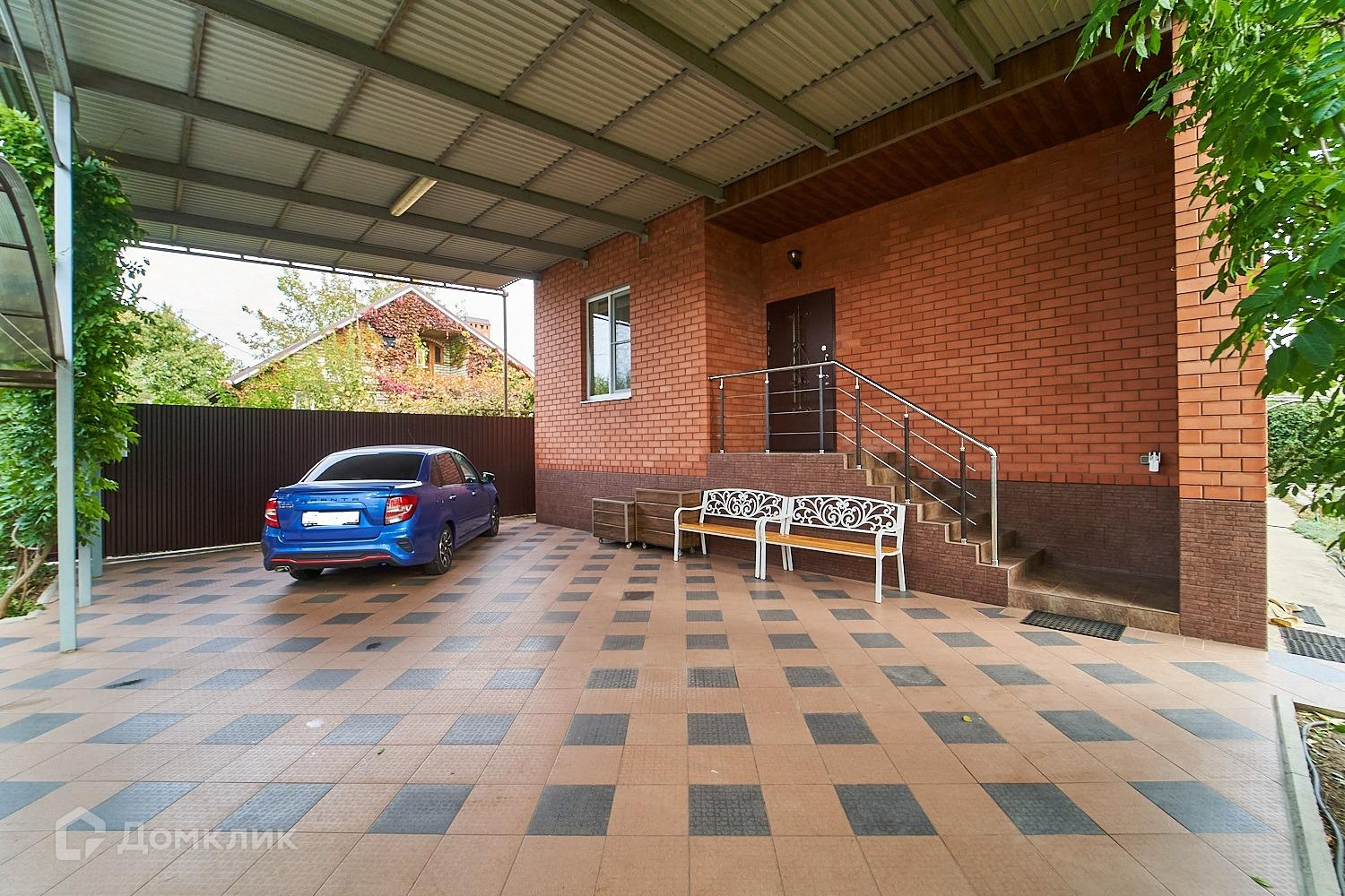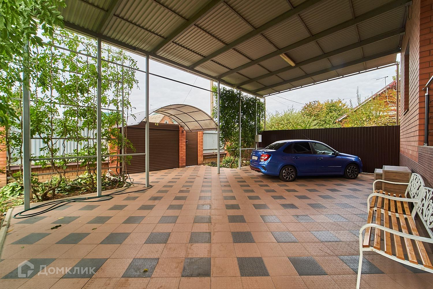 Двор выложен плиткой накрыт навесом для трех машин.