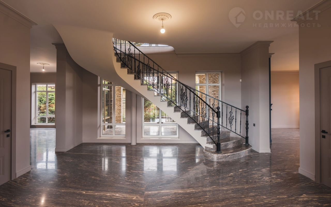 Отделка из качественных материалов и продуманные детали делают каждый элемент важным. Изящная лестница на второй этаж с перилами из чугунного литья и мраморными ступенями придает дому особую элегантность. Мраморные полы с подогревом создают атмосферу комфорта и тепла круглый год.