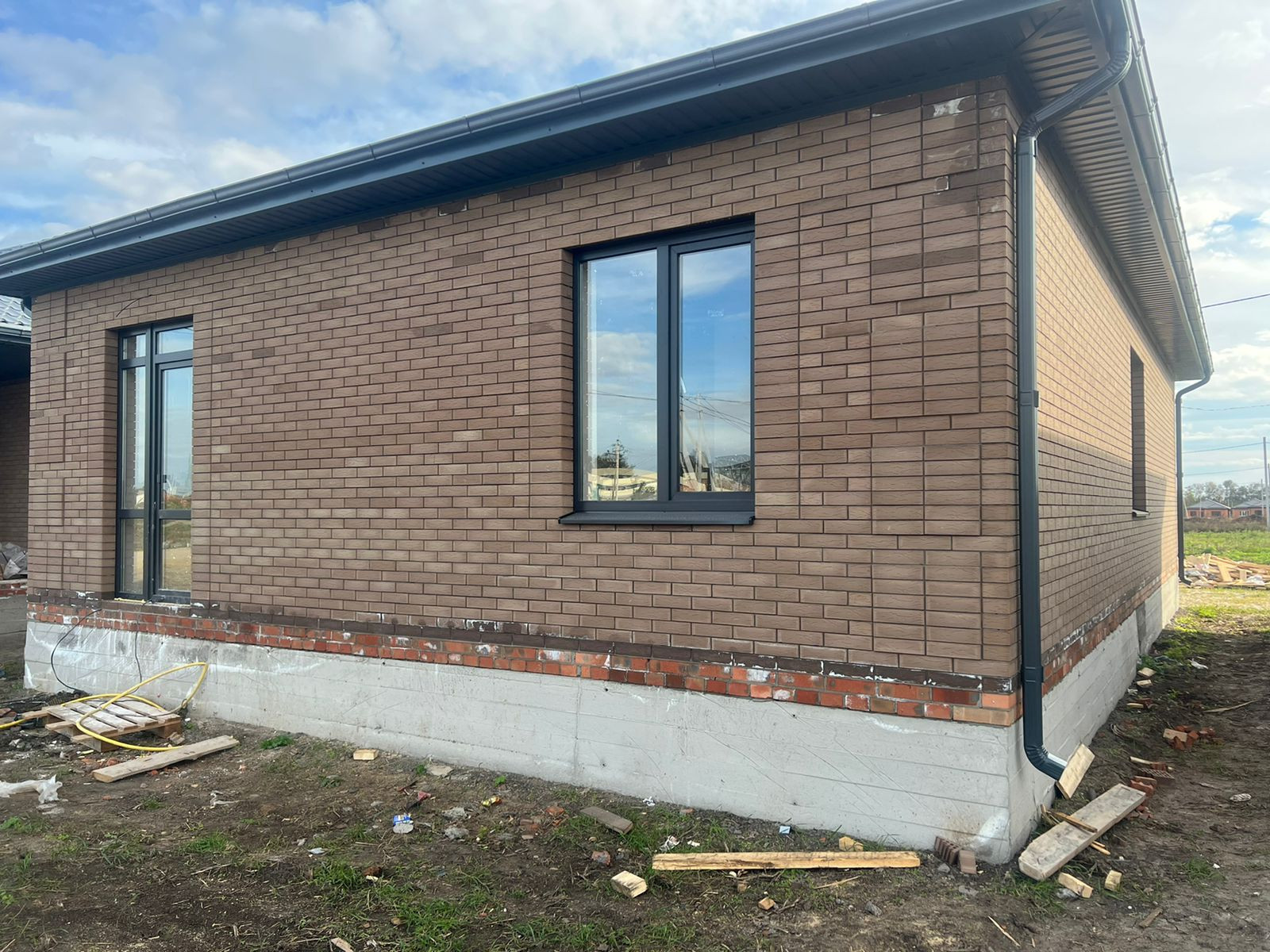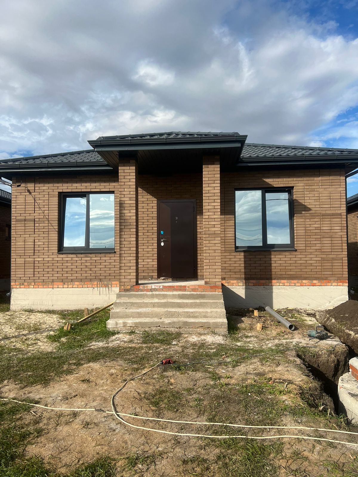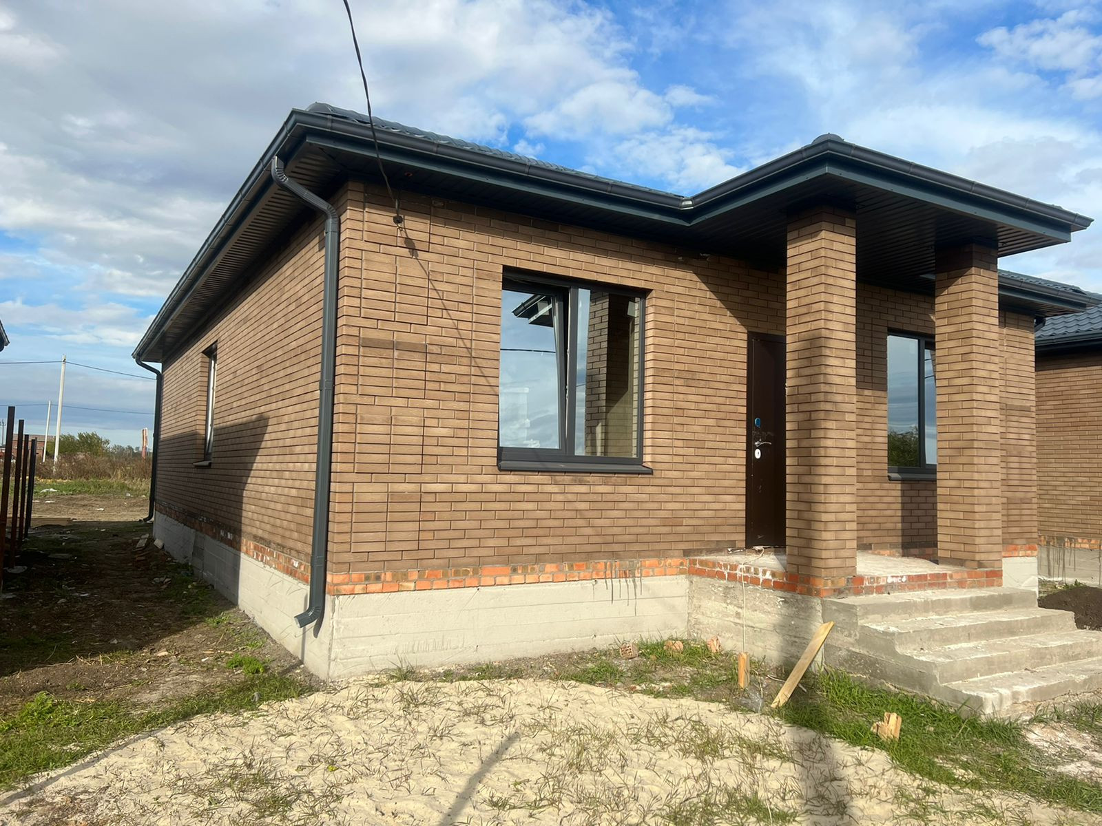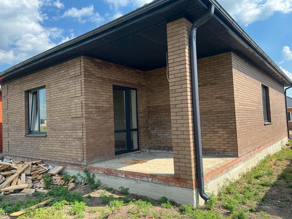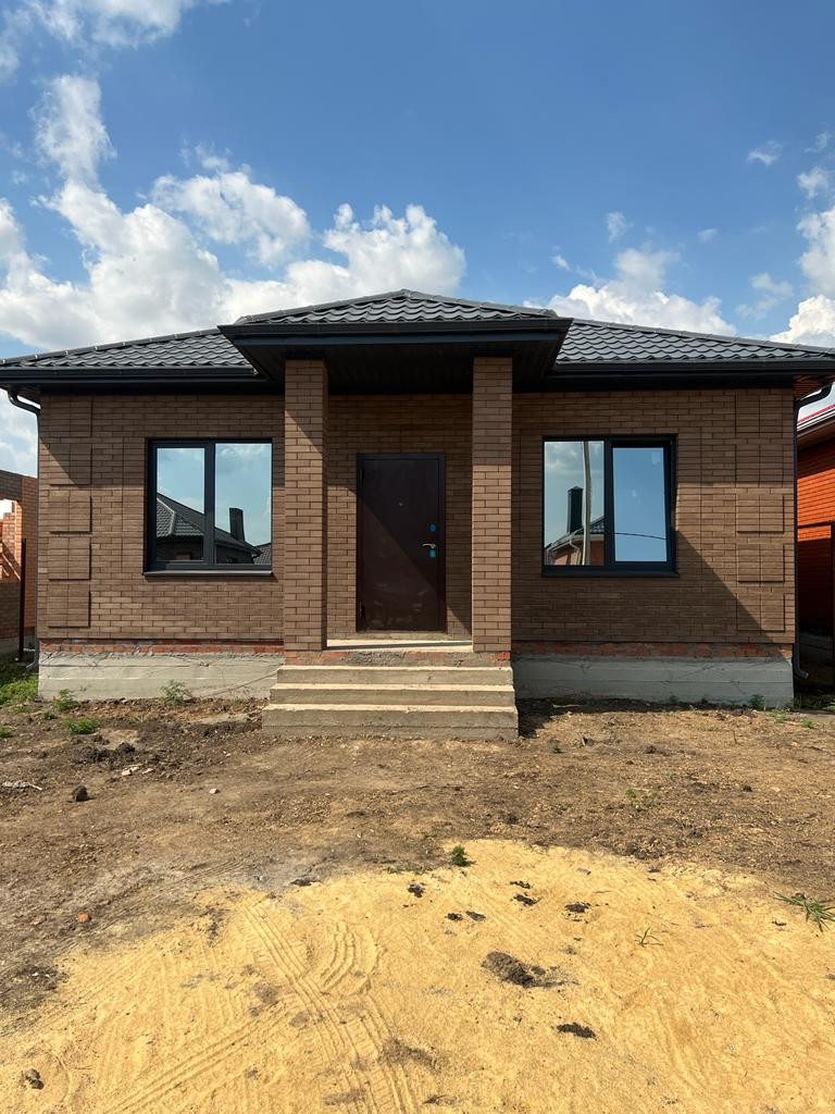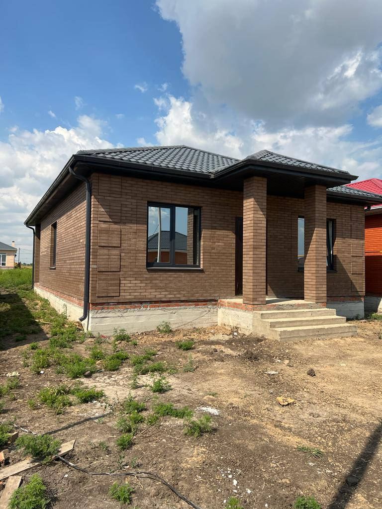 Дом кирпичный 2022г. с удачной планировкой: 3 комнаты (18кв.м.+16кв.м.+14кв.м.) , кухня-гостиная (25кв.м.), с выходом во двор в зону барбекю, окна м\пл., крыша м\ч., высота потолков 3м., свет, газ, вода в доме, сливная яма, межкомнатные перегородки кирпич, все коммуникации уже в доме.