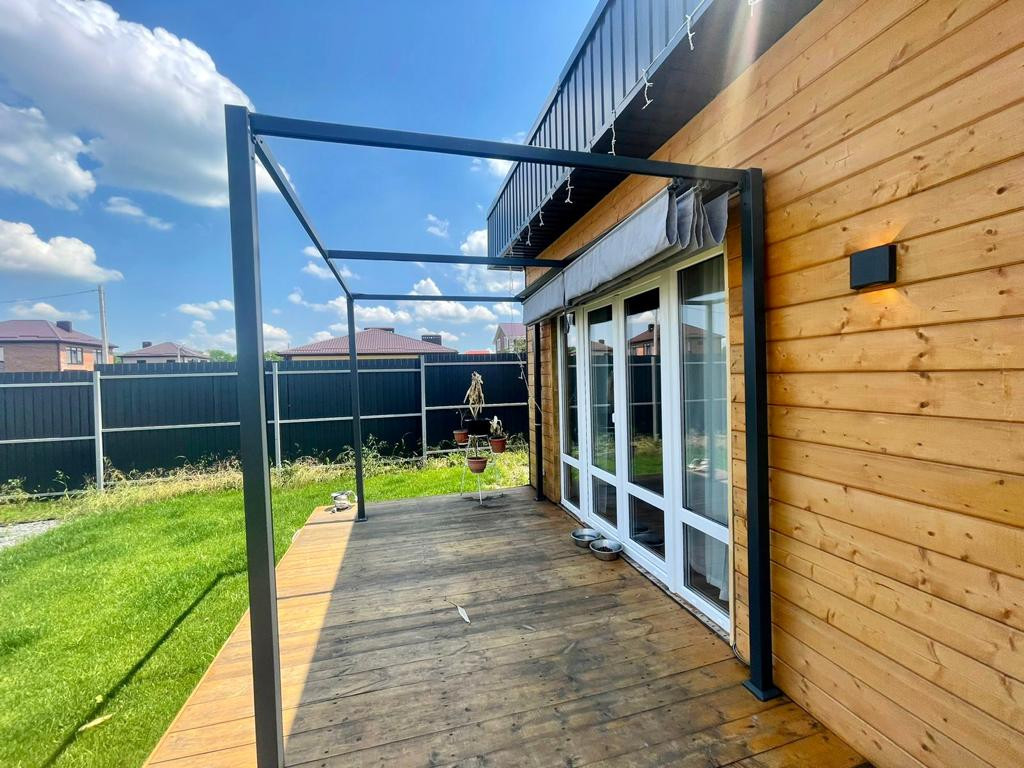 на террасе, установлена складная пергола.