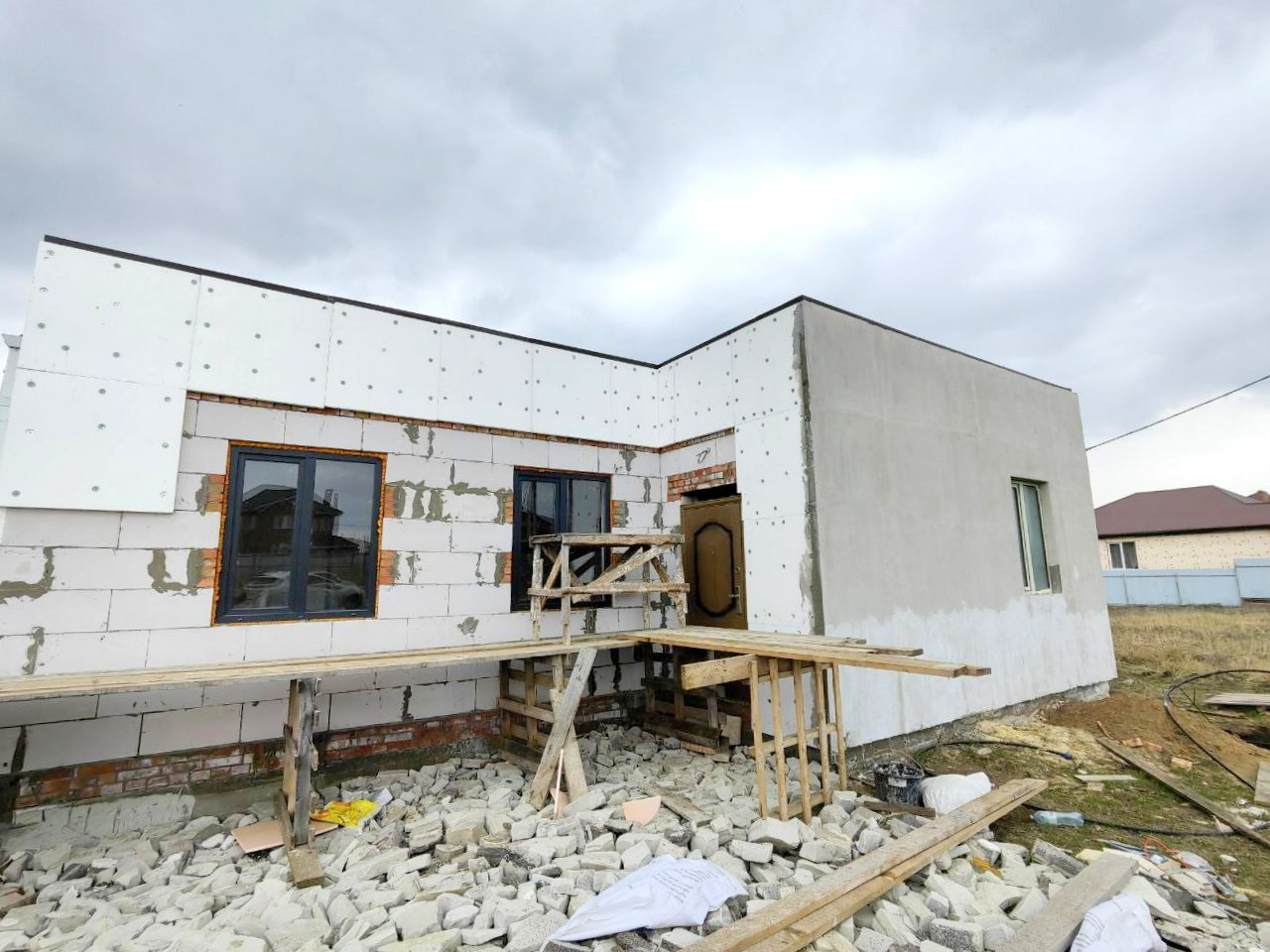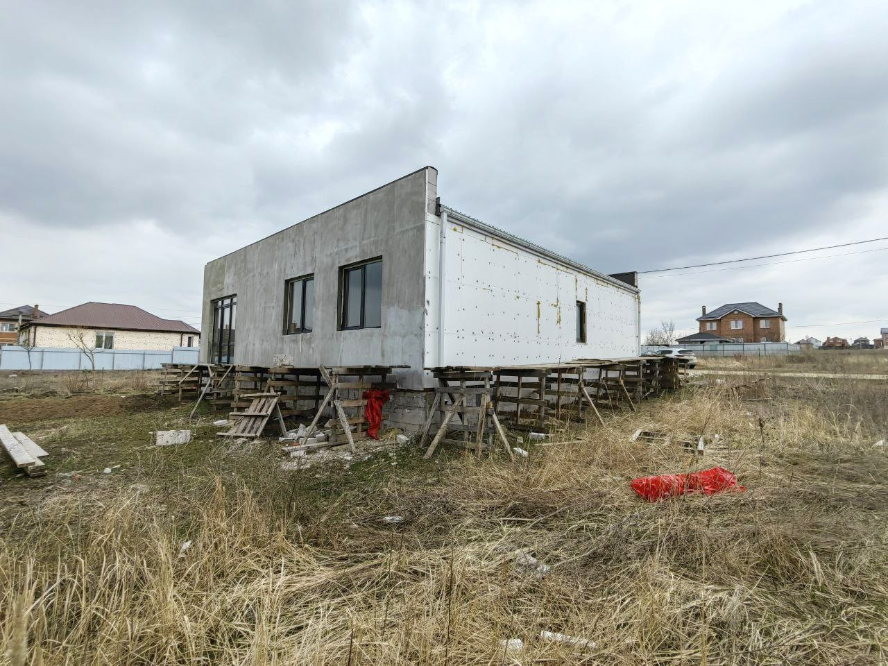 Строительство дома было приостановлено в зимнее время , на данный момент строительство продолжается .