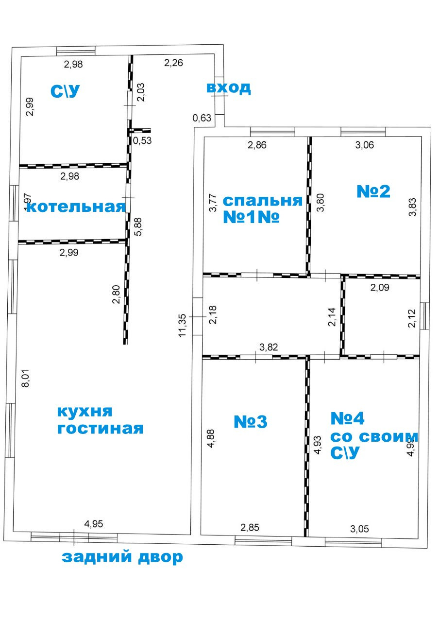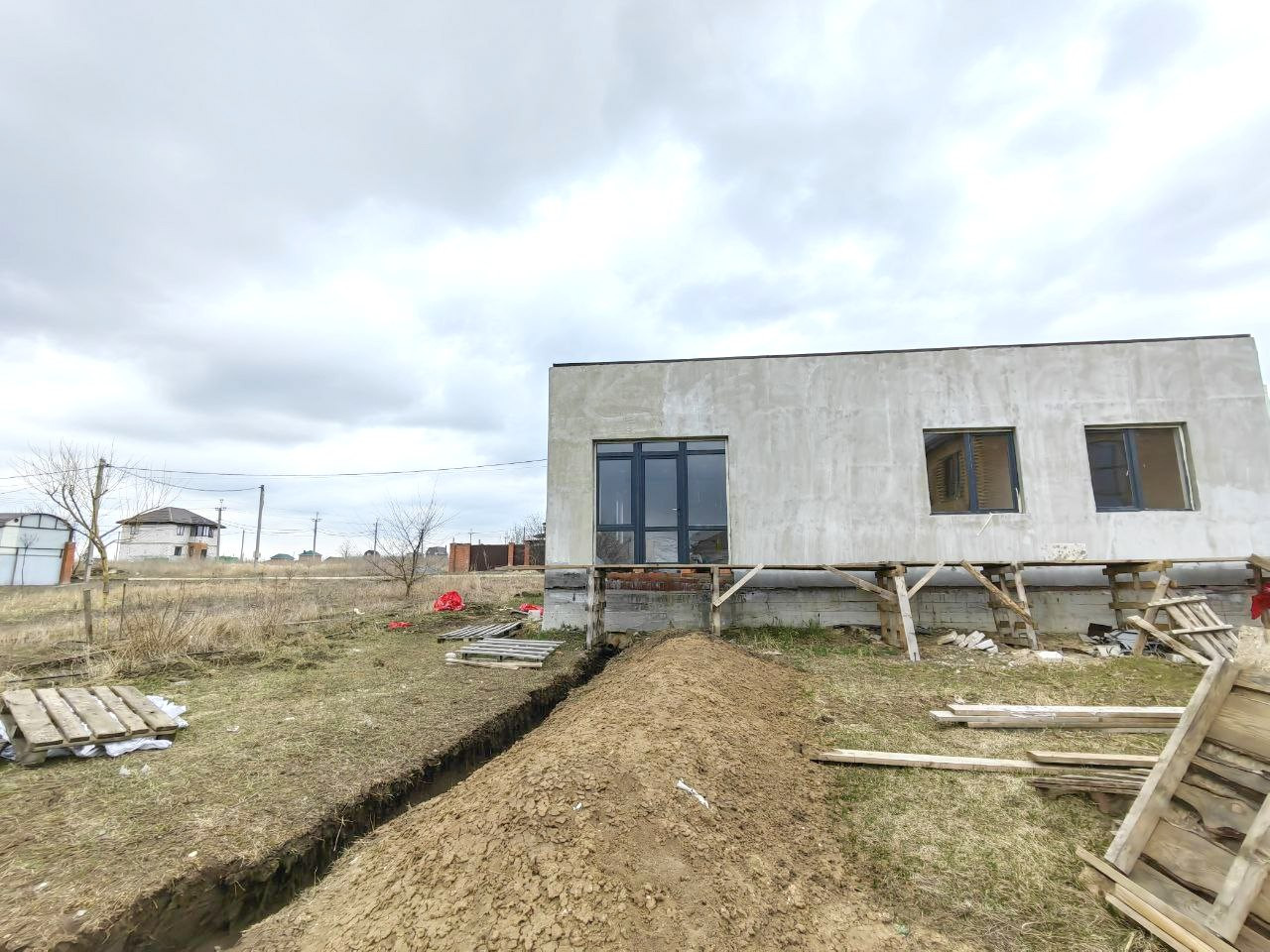 Площадь дом 137 м2 , четыре просторные спальни , кухня гостиная с панорамным выходом на задний двор . Все коммуникации в дом заведены , стены штукатурка , двойные стеклопакеты .