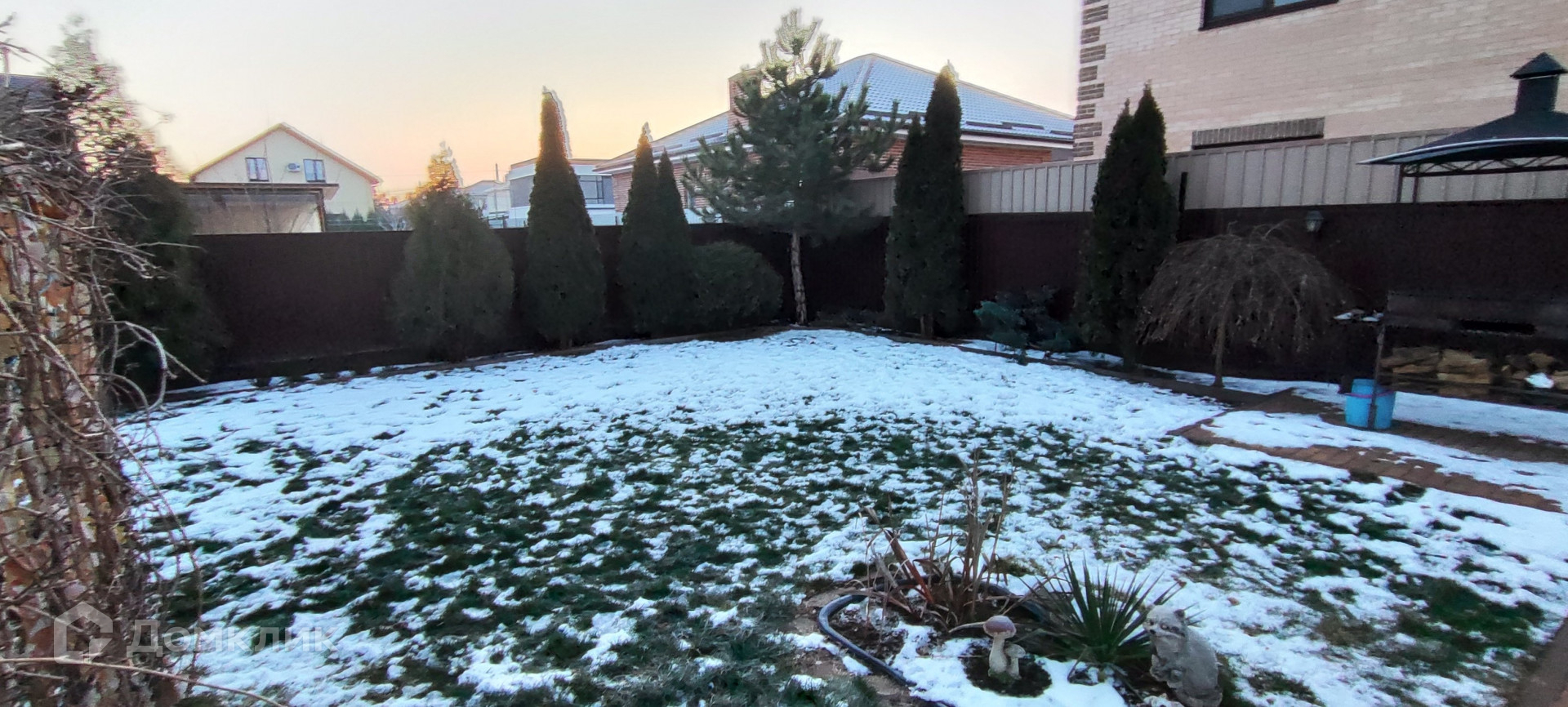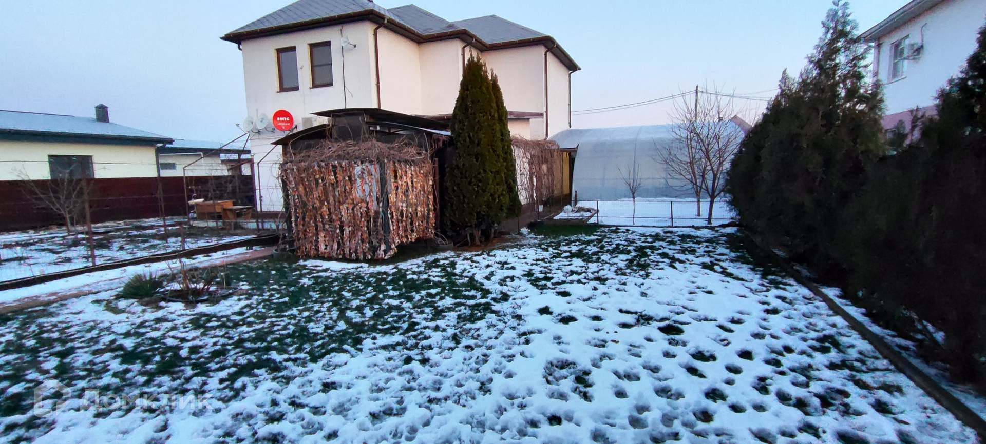 Дом снаружи утеплен и покрыт декоративной штукатуркой, двор вымощен тротуарной плиткой. Гараж на два автомобиля с автоматическими воротами, мангальная зона, летняя беседка с качелью, газон с системой автополива, сад с молодыми деревьями и виноградниками.