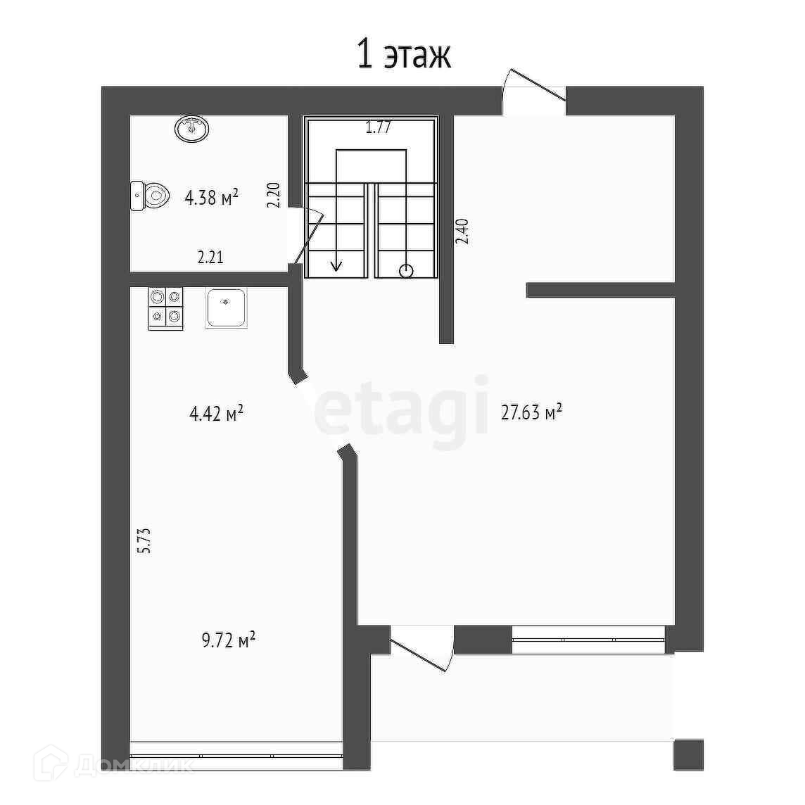 На 1-м этаже : кухня-столовая, гостиная, комната и с/у. На 2-м этаже: 3 отдельные комнаты и с/у.