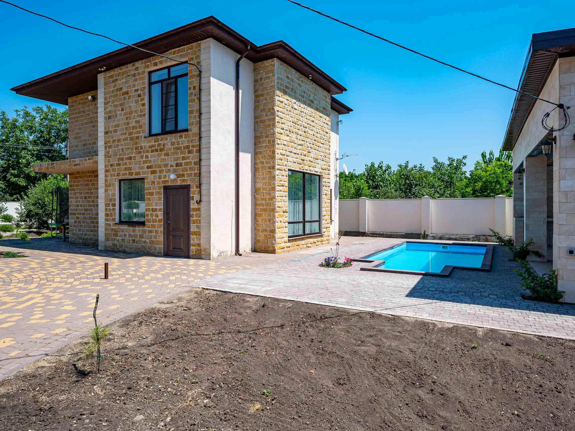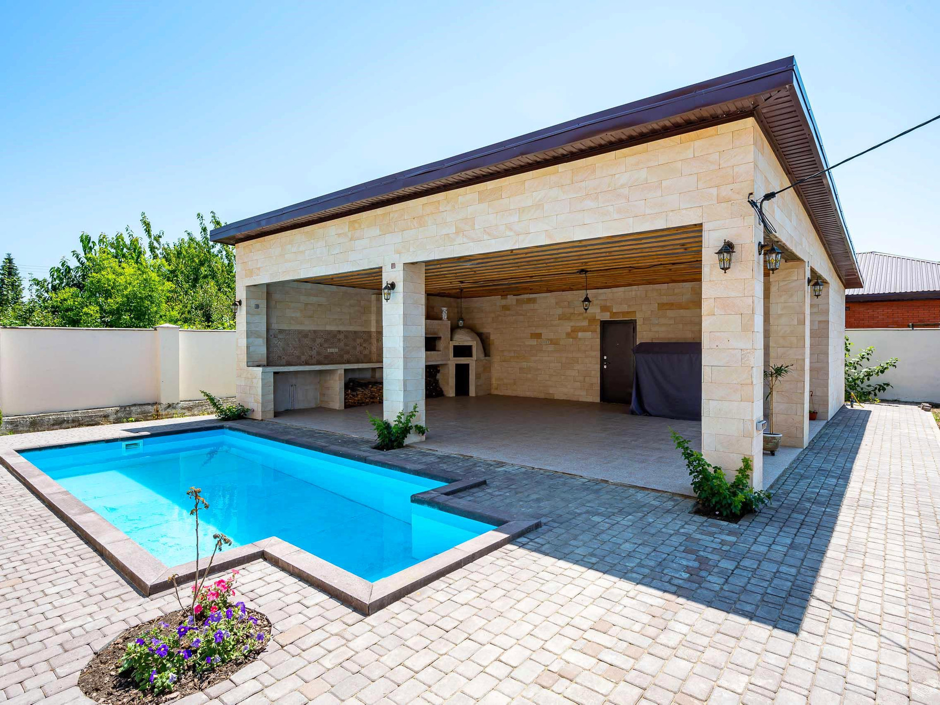 Отличный глубокий бассейн с подсветкой и лежаками для отдыха и принятия солнечных ванн, рядом мангальная с кухонной зоной из камня и печью для приготовления кулинарных изысков которыми вы сможете удивить всех ваших родных и близких. И все это находится в капитальном строении которое изначально задумывалось как второй 2х этажный дом, но в после за лития фундамента решили сделать огромную беседку с баней, душевой и подсобной, аппаратной комнатой. Строение сделано из монолитного каркаса с армо поясом и его можно без проблем сделать жилим просто поставив панорамное остекление.