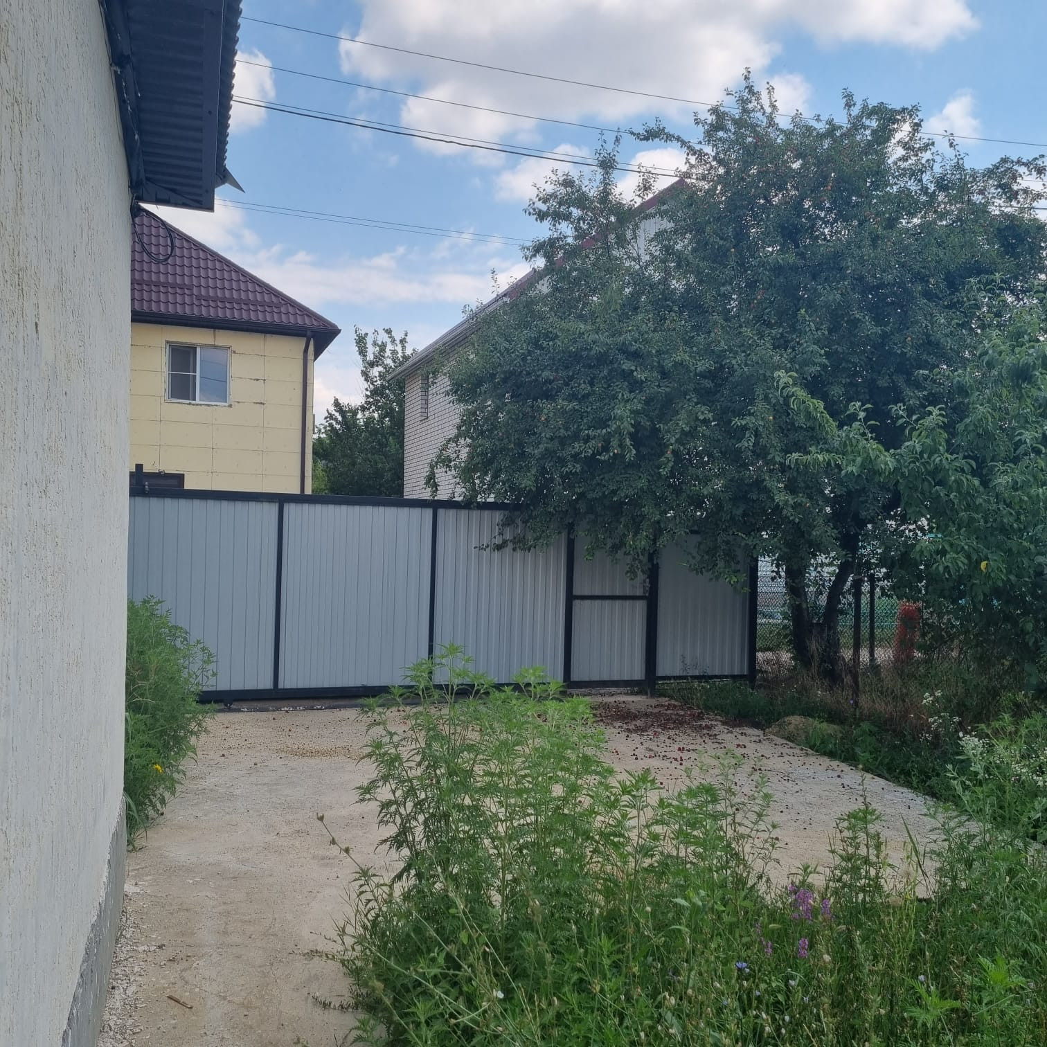 Залита площадка под авто, установлены ворота и калитка из металлического профиля.