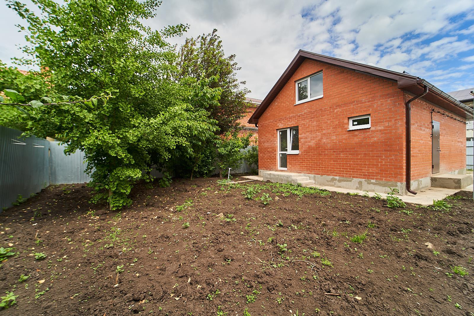 Двор огорожен забором, установлены откатные ворота, обустроен въезд и парковка для нескольких автомобилей. Участок позволяет разместить гараж, сад, бассейн и баню.