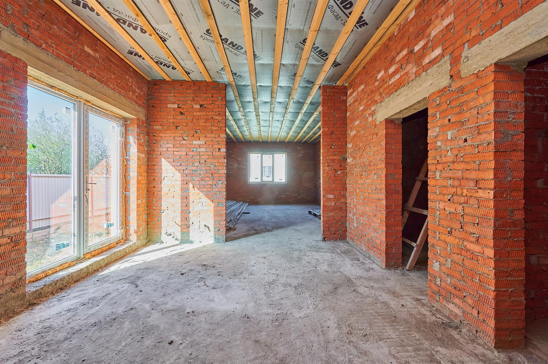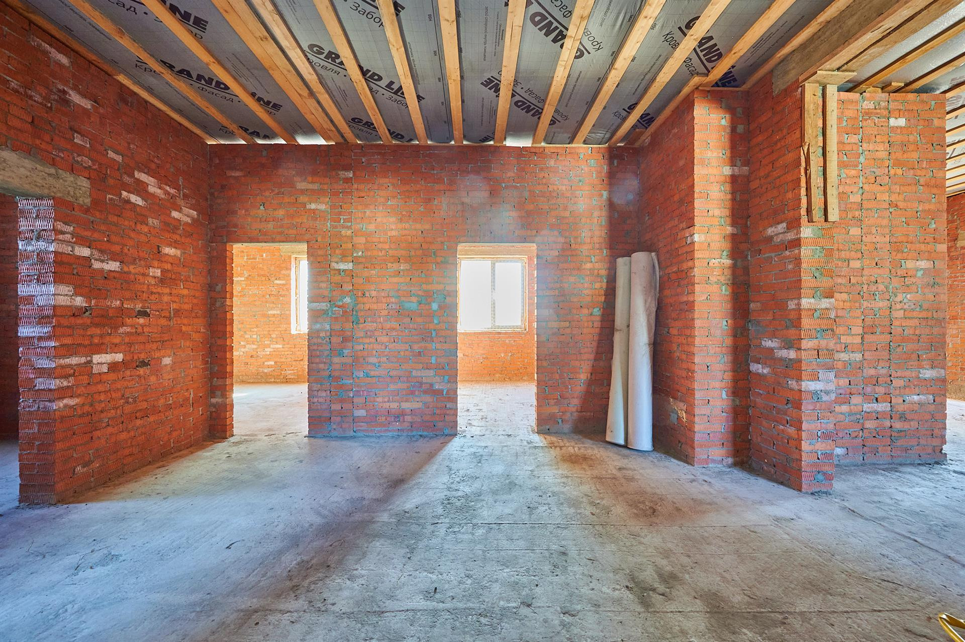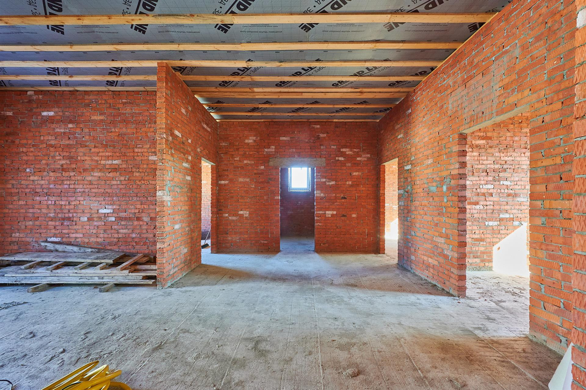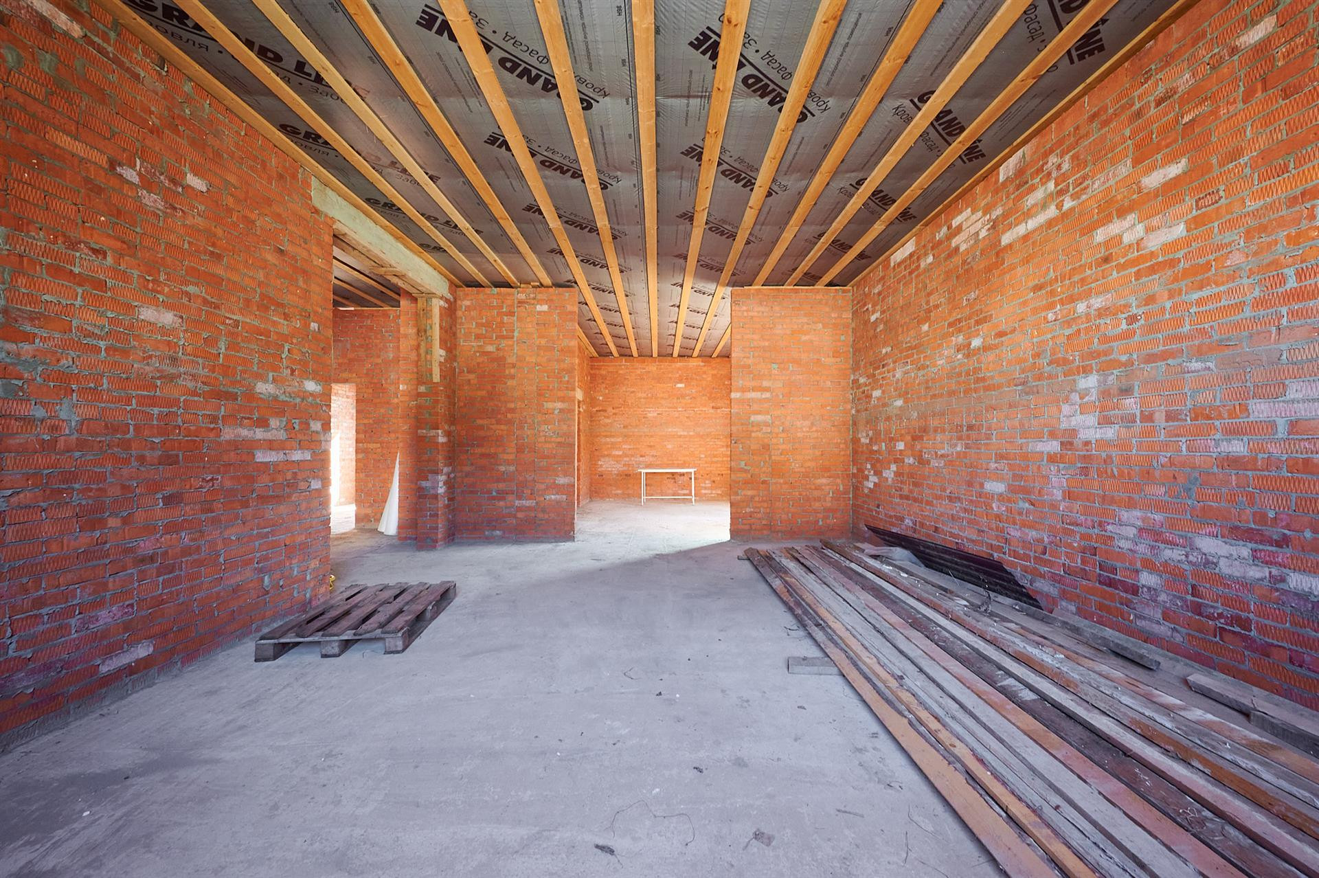 Фундамент состоит из двух уровней монолитных ФБС-блоков, на них лежит армированная бетонная плита 26 сантиметров. При строительстве использовалась арматура 14-го диаметра. Дом состоит из полутра кирпичей, кирпич кладки и облицовка Итальянцем. Что дарит сам дарит самую лучшую звуковую и температурную изоляцию. Летом прохладно, зимой тепло.