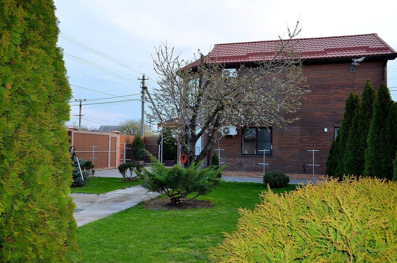 Облагороженный двор, выполнено озеленение (газон, хвойные, плодовые растения), есть теплица, дорожки, клумбы. На территории участка есть баня и капитальная хоз. постройка для хранения инвентаря, летняя кухня. Территория находится под видеонаблюдением.