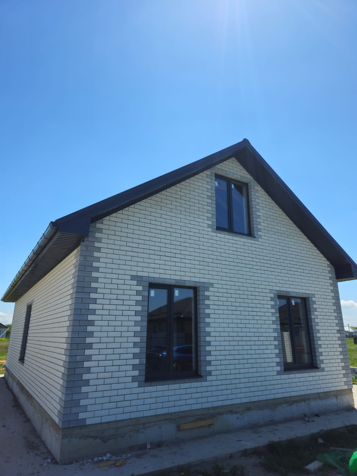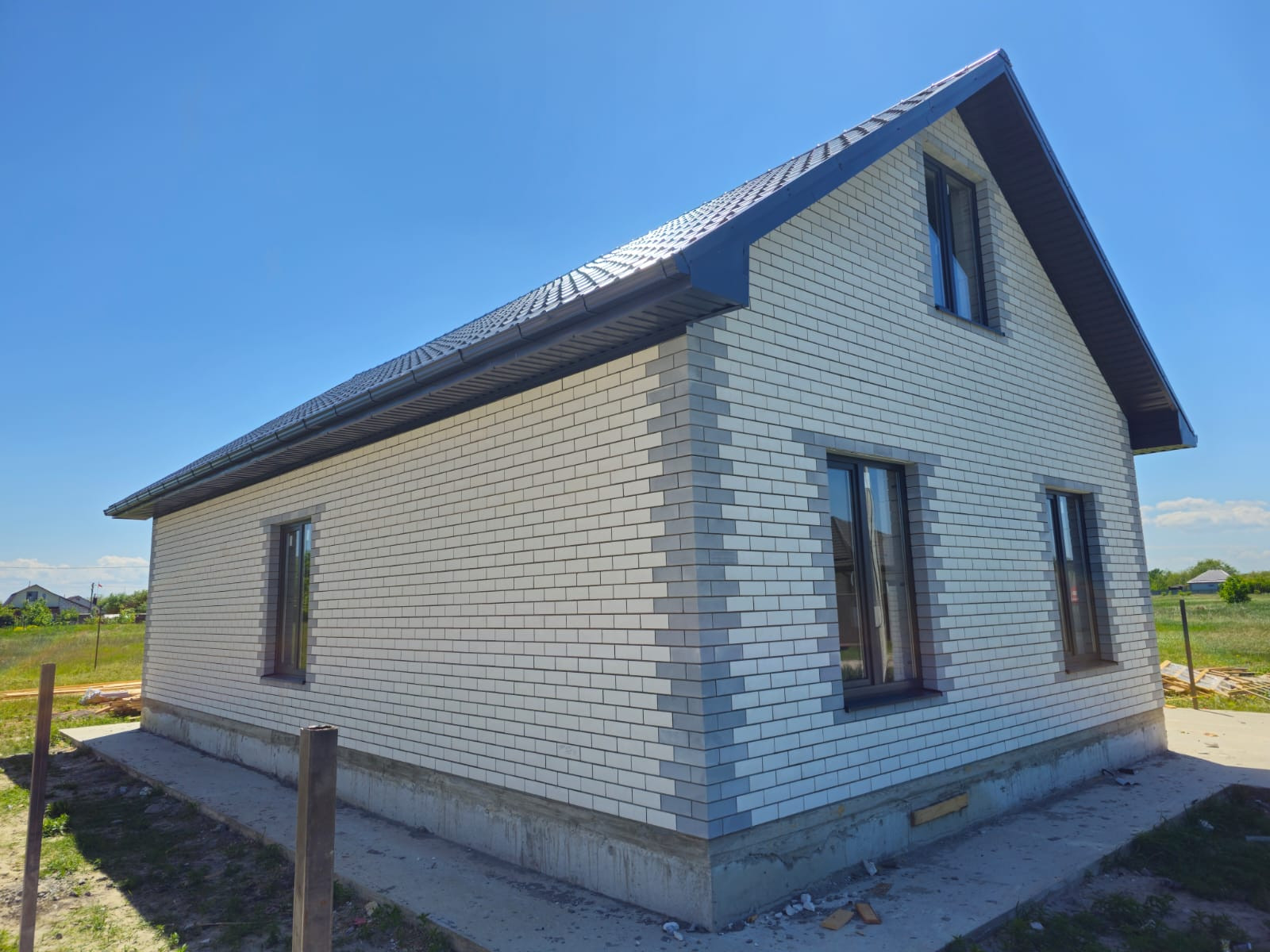 Новый современный дом из кирпича светлых тонов;