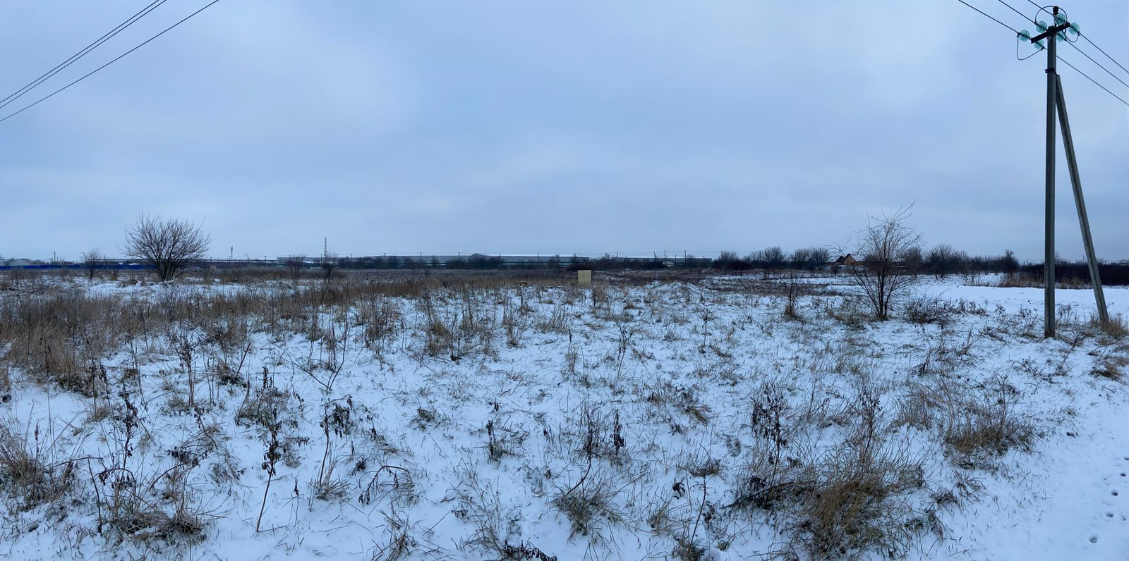 Сзади участка расположено более гектара свободной, не распланированной земли (можно увеличить свой участок). По фасаду вдоль улицы идут столбы с электрическими кабелями.