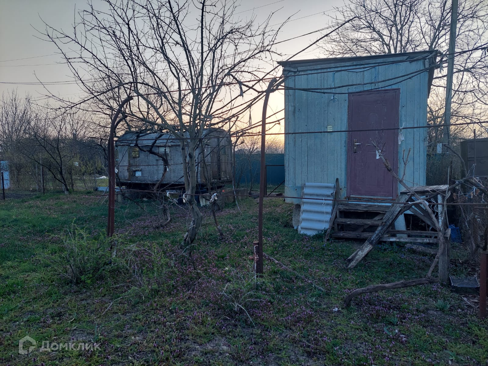 На участке имеются скважина для полива, два больших вагона-бытовки для хранения инвентаря и прочих вещей, плодовые деревья и кустарники.