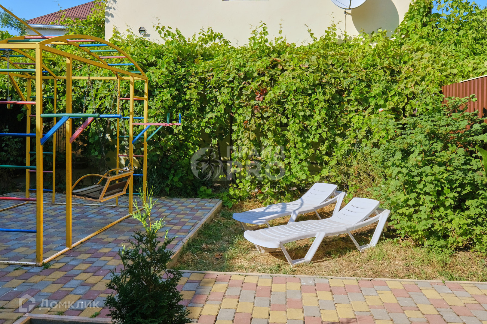 Участок площадью 11,14 сотки имеет три фасада, что позволило организовать три самостоятельных входа. С одной улицы автоматические ворота для въезда автомобилей на территорию собственников, с другого фасада - калитка для отдыхающих. Третий фасад выходит на другую улицу, тут также имеются ворота и парковочные места для автомобилей. Вся территория под видеонаблюдением.
