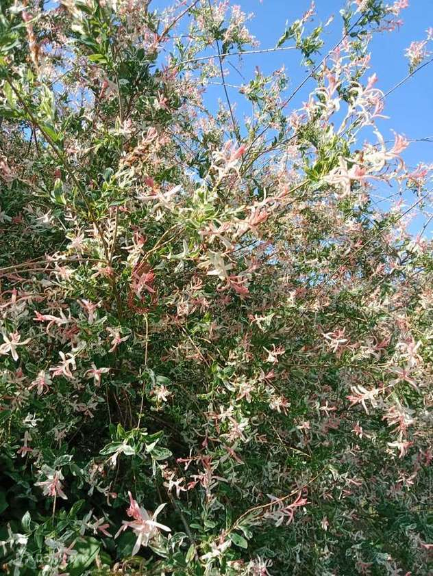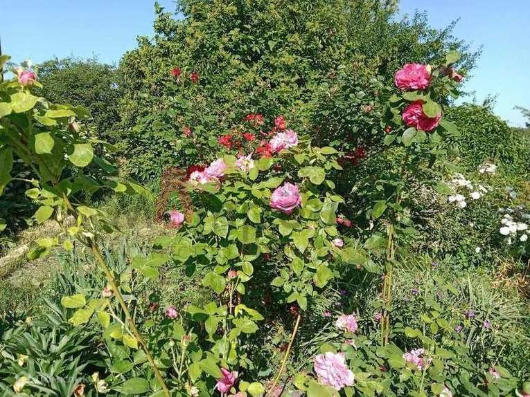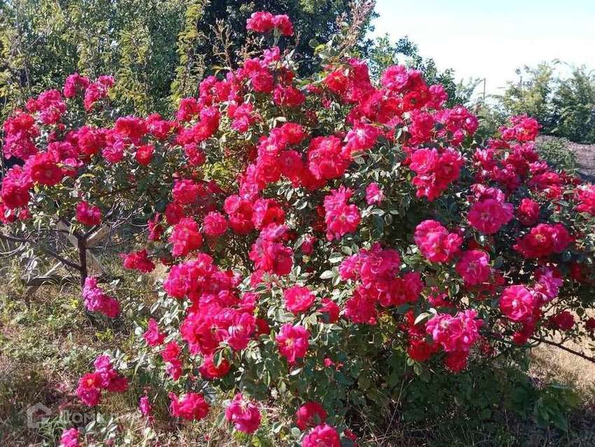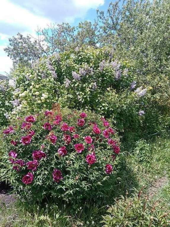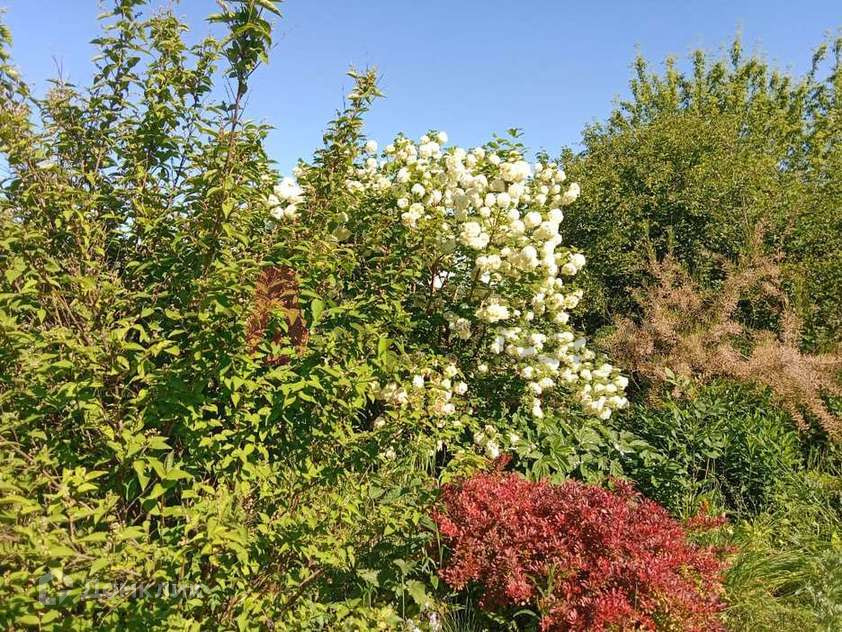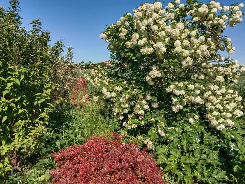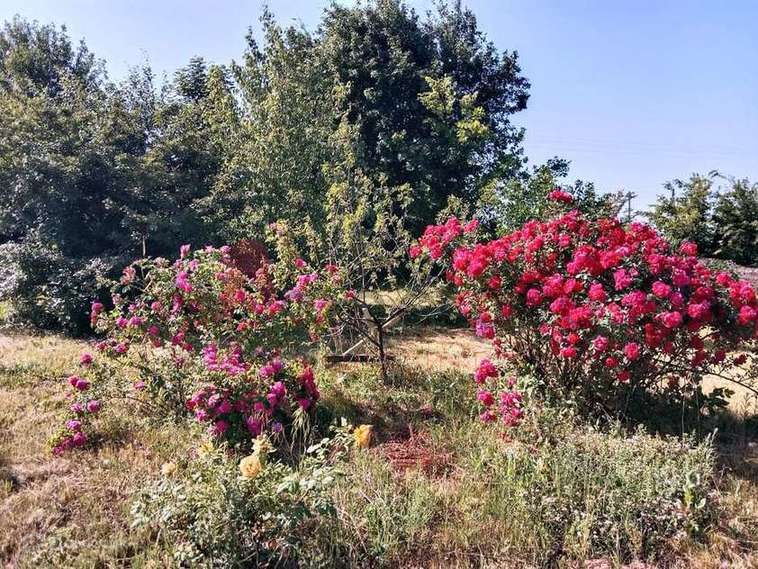 Разбит чудесный сад с плодовыми и декоративными деревьями и кустарниками: плодоносящие яблони, абрикос, груша, слива, вишня, черешня, малина, смородина черная, красная, розовая и белая, черноплодная и обычная рябина, японская ива, пендула, пионы, розы.