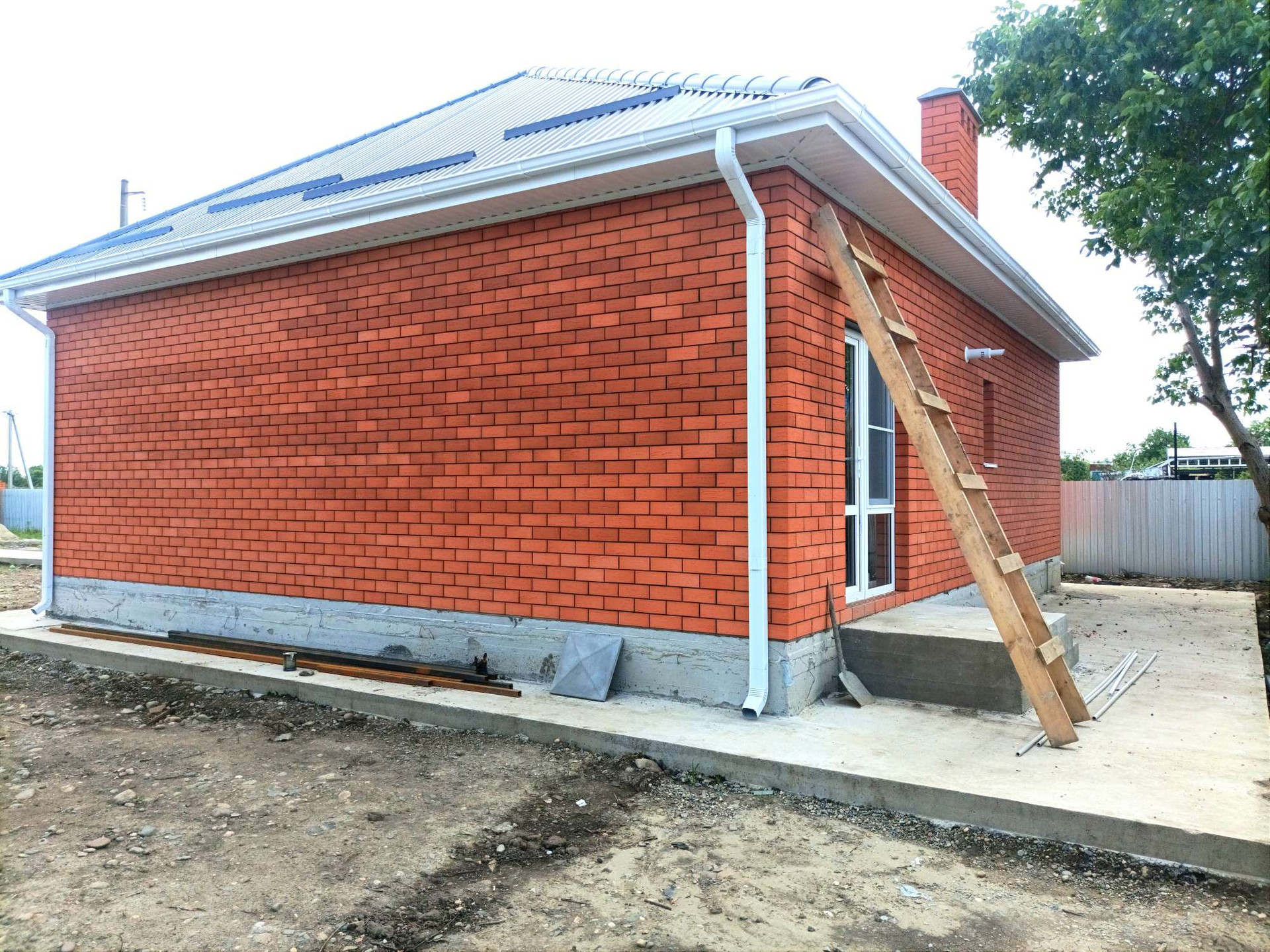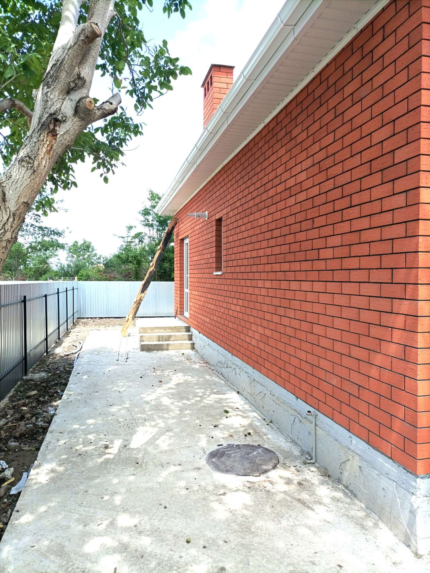Забор из профнастила с кирпичными колоннами, откатные ворота, калитка.