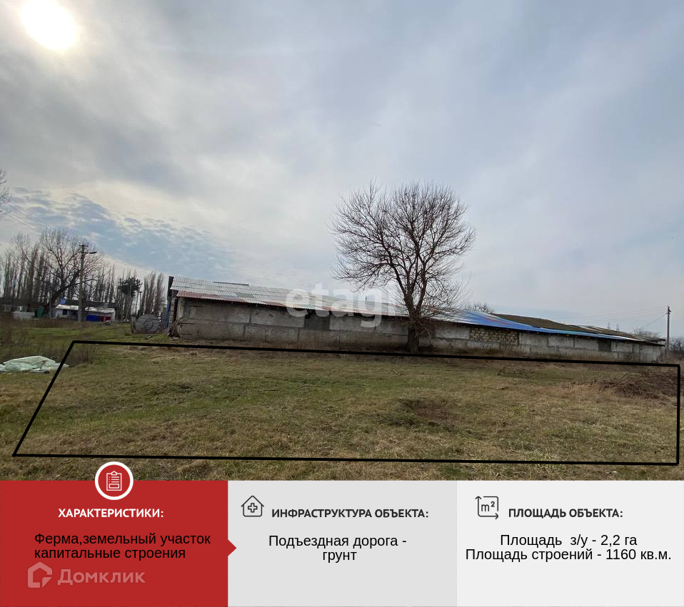 На территории теплица из поликарбоната, капитальные строения общей площадью 1160м2 (сеновал, зернохранилище, стойловое содержание быков у которых располагаются автопоилки, помещение для свиней с автокормушкой, также имеется домик для проживания персонала.Имеется пруд, который можно оплодородить, зарыбить для рыбалки. Плодородная земля, своя вода (колодец 15м) вода круглогодичная. Электричество 380В (3фазы). Подъездная дорога отсыпана щебнем.