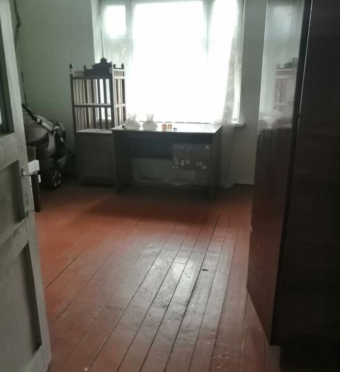 Дом советской постройки, 2-этажный, квартира торцевая, вход отдельный. На 1-м этаже кухня и комната 15 кв.м., на втором - две спальни по 13 кв.м. Санузел на улице. Состояние квартиры жилое - полы, окна, двери деревянные, стены окрашены. Отопление печное, вода и электричество центральные.
