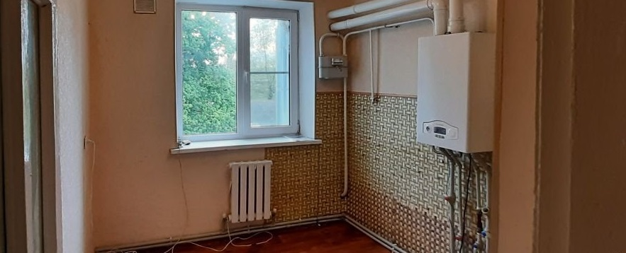ID 5314    3-комнатная квартира с индивидуальным газовым отоплением в 2-этажном доме на 2-м этаже. Общая площадь квартиры 44 кв.м. Планировка: кухня 7 кв.м., две небольших раздельных спальни и проходная гостиная комната (жилая площадь 27 кв.м.). Ремонт косметический, окна металлопластиковые, новый газовый котел и радиаторы отопления, линолеум, обои, санузел в плитке, сантехника вся в наличие (фото соответствуют).