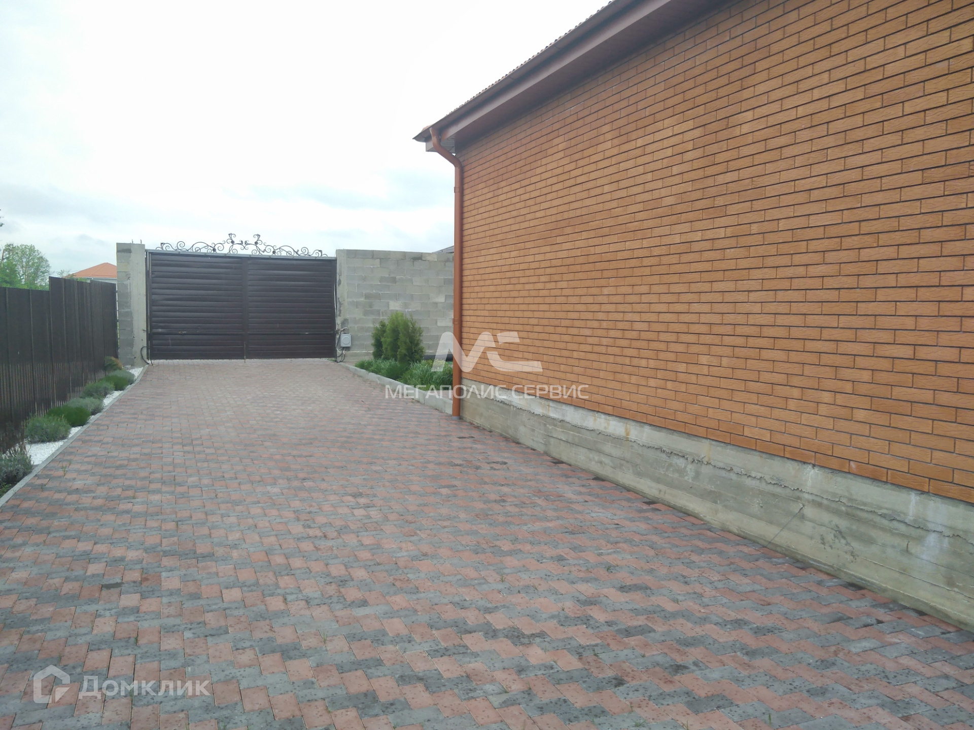 Вокруг дома высажены декоративные насаждения. Ворота распашные, на пульте.