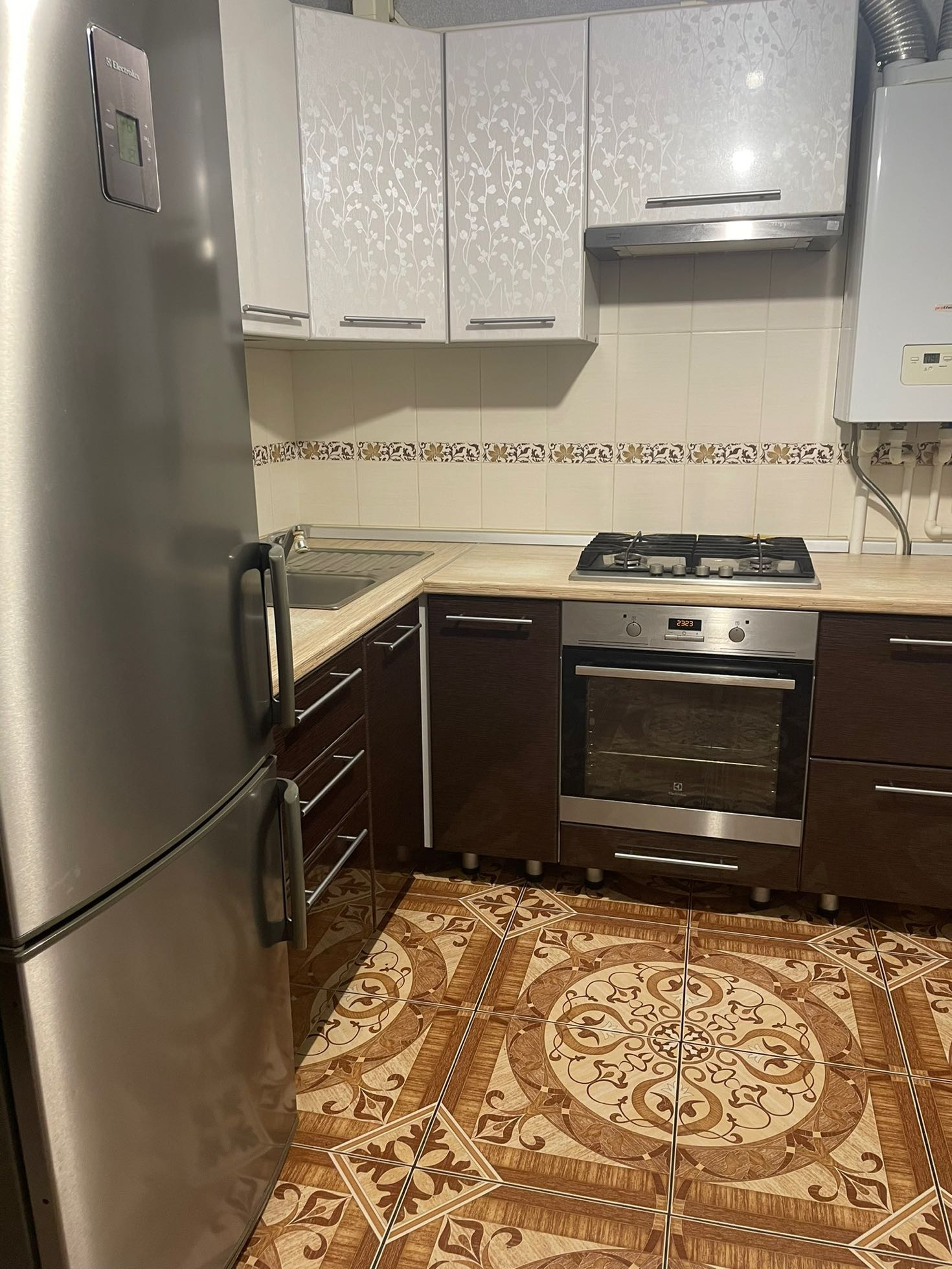 Площадь кухни 9,2 кв.м. Кухонный угловой гарнитур со встроенной техникой  Electrolux (газовая панель, духовой шкаф, двухкамерный холодильник).