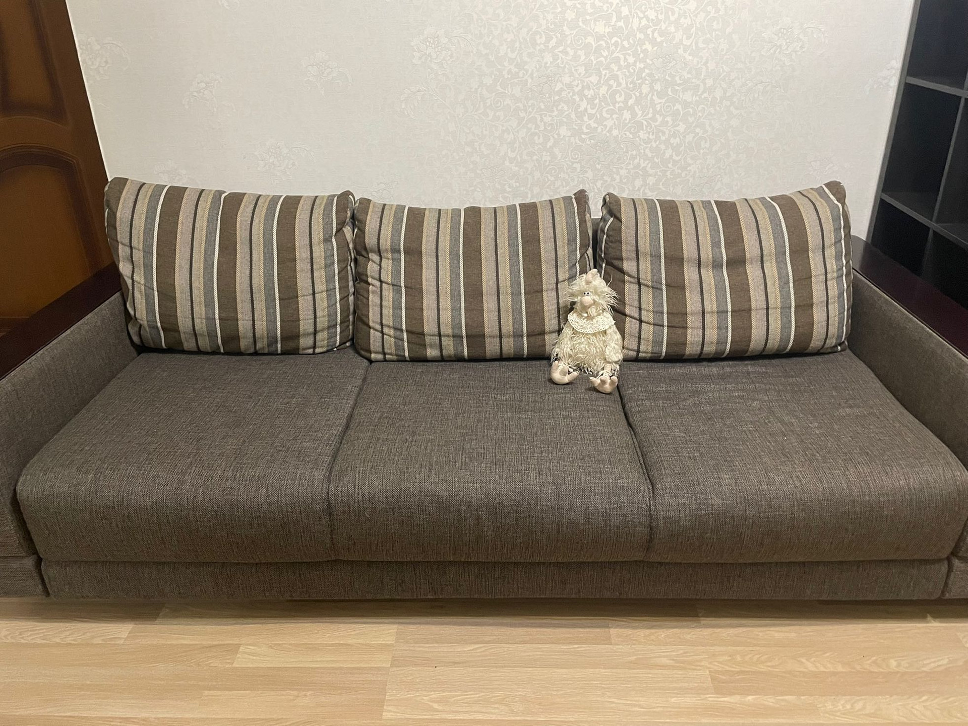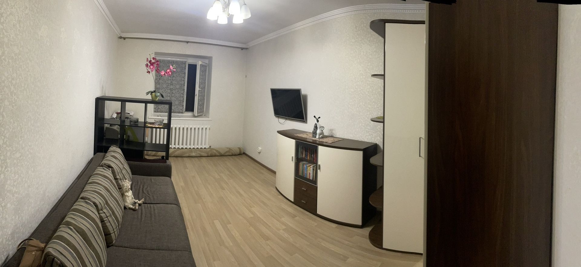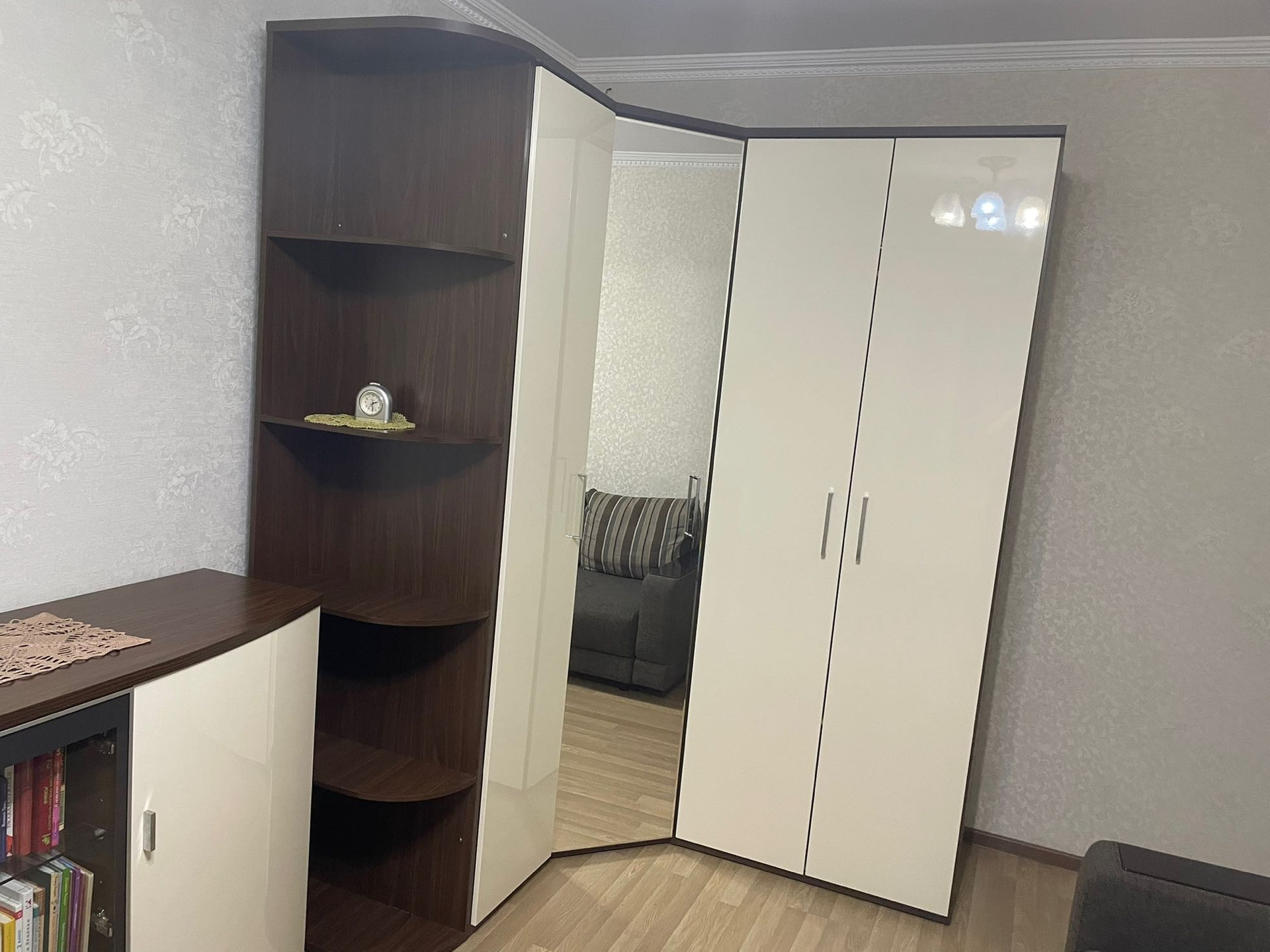 В большой комнате остается диван фирмы Pushe. Вместительный 4-х секционный угловой шкаф и комод фирмы Шатура с глянцевыми фасадами.