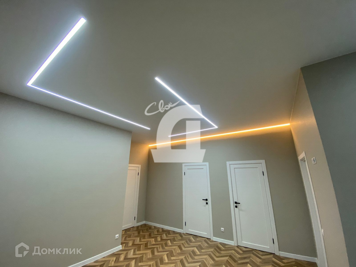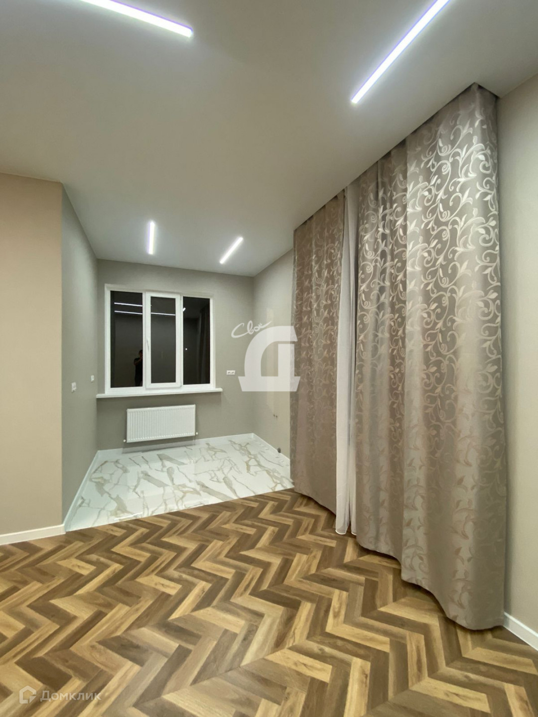 Евроремонт, пол качественный ламинат 12мм, в кухонной зоне и в ванной комнате плитка, освещение световыми лентами, подсветка штор. Сделано достаточное количество розеток в кухонной зоне и в комнатах. Стены спокойных тонов обои, двери современного дизайна, входная дверь с терморазрывом.