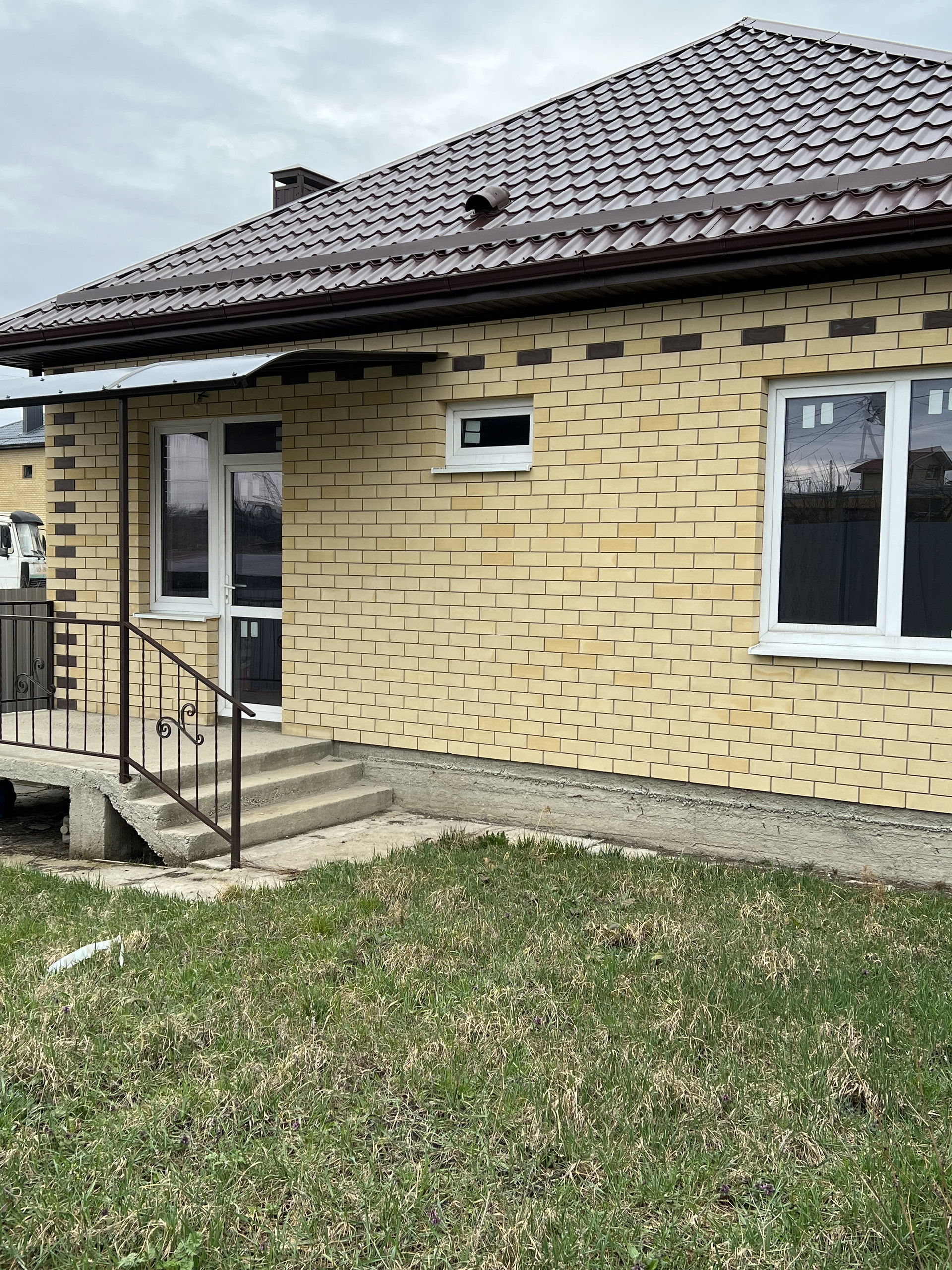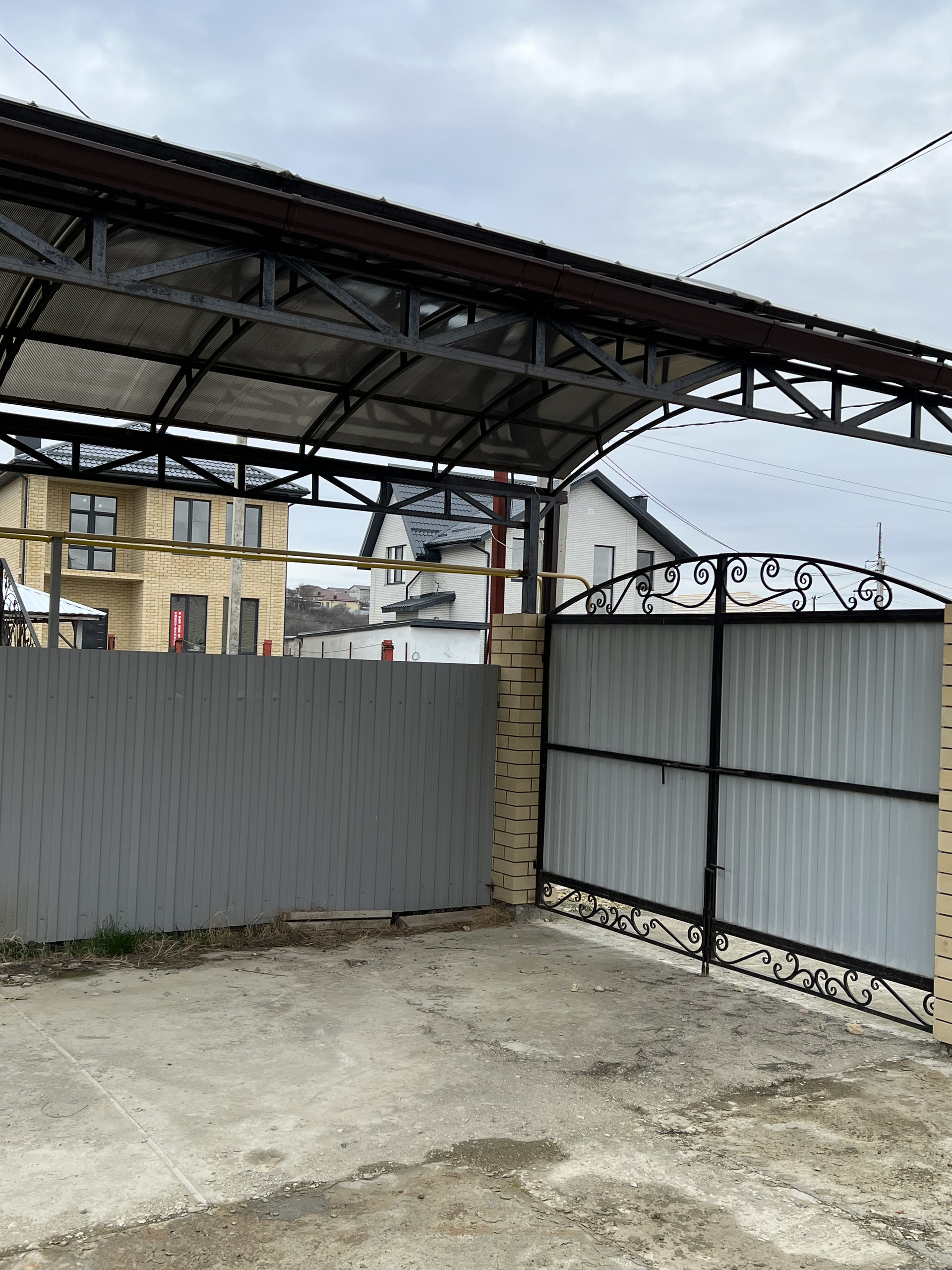 Подъезд к дому и отмостка забетонированы и над стояночным местом для машины сделан навес из поликарбоната.