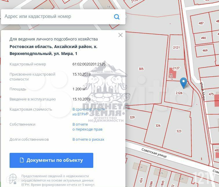 Продаётся земельный участок площадью 12 сот.           Участок находится: Ростовская обл., Аксайский р-он, хутор Верхнеподпольный, ул. Мира, 1.           Участок ровный, имеет правильную форму, участок у дороги, все коммуникации по меже (газ, вода, электричество). На участке постройки отсутствуют.           Межевание участка проведено           Категория земель: для ведения личного подсобного хозяйства.