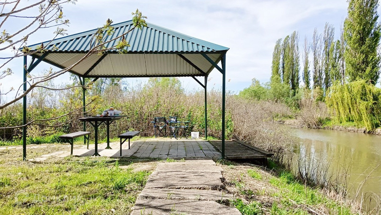 Беседка для комфортной рыбалки на берегу канала, искуственный пруд с выходом в канал для стоянки лодок. Фруктовый сад с поливом.