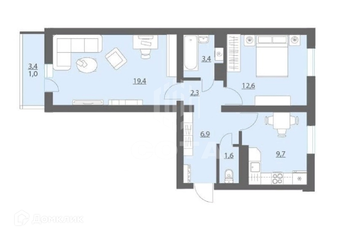 Качественная отделка, разумная планировка: кухня 9,7 кв.м., комнаты 19,4 кв.м и 12,6 кв.м, просторный хол, раздельный санузел (есть место и подвод для стиральной машинки), лоджия с витражным остеклением.