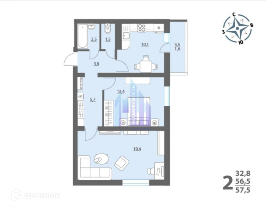 Общая площадь 57.5 м2