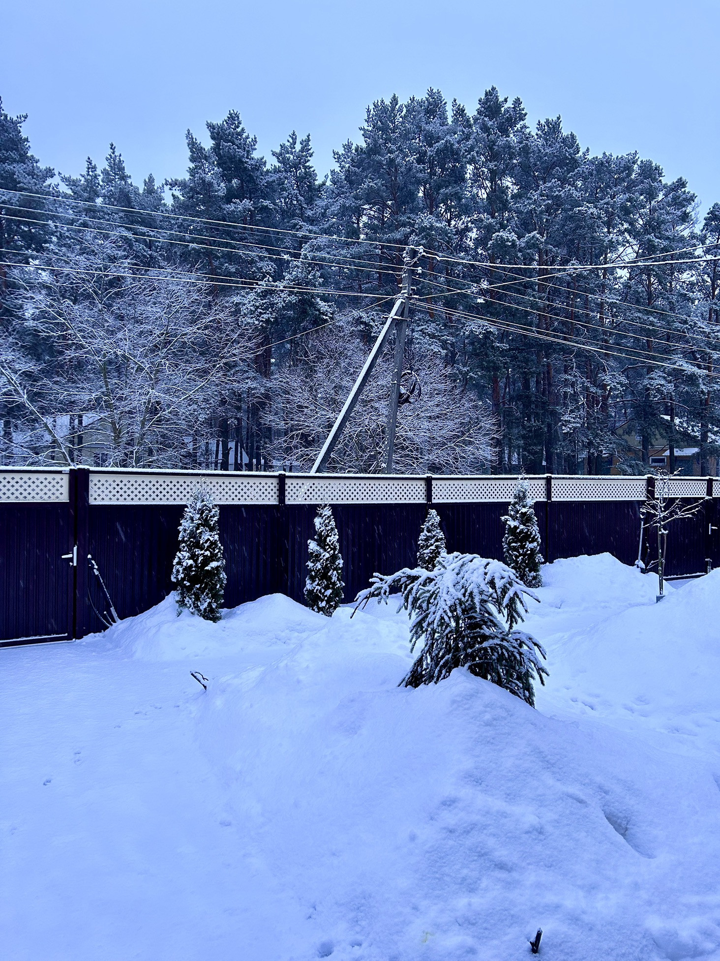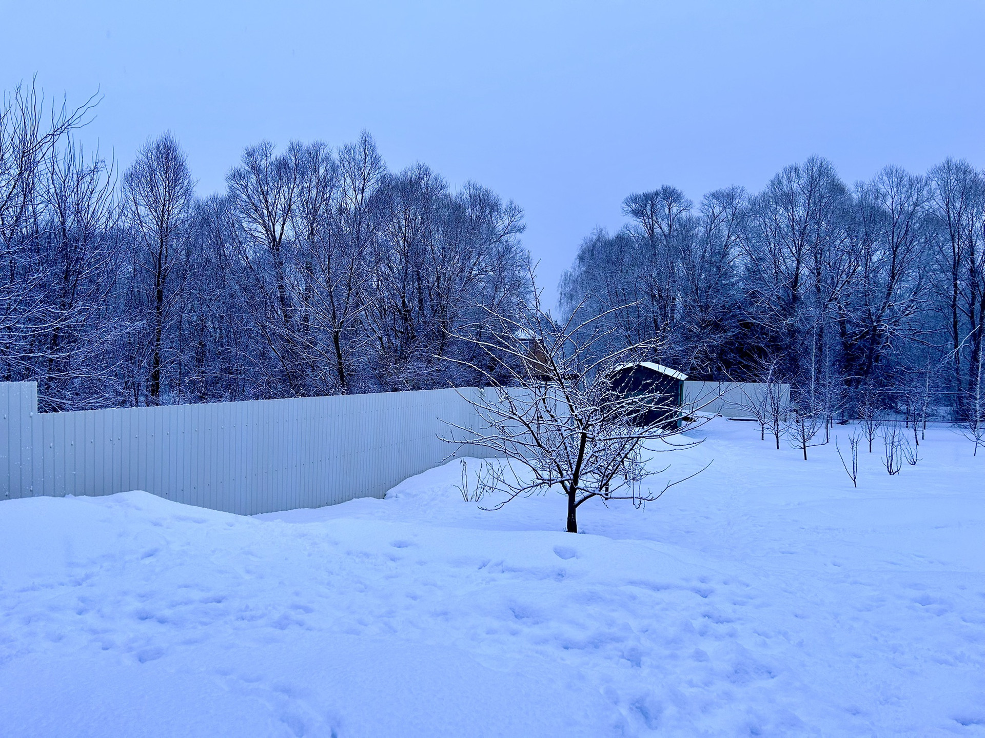 Ограждение территории: по главному фасаду модульное ограждение (забор, калитка, распашные ворота) из двустороннего профлиста Grandline; боковые и задний фасады из профлиста и сетки-рабицы. Имеется боковой заезд на участок, установлены распашные ворота из профлиста.