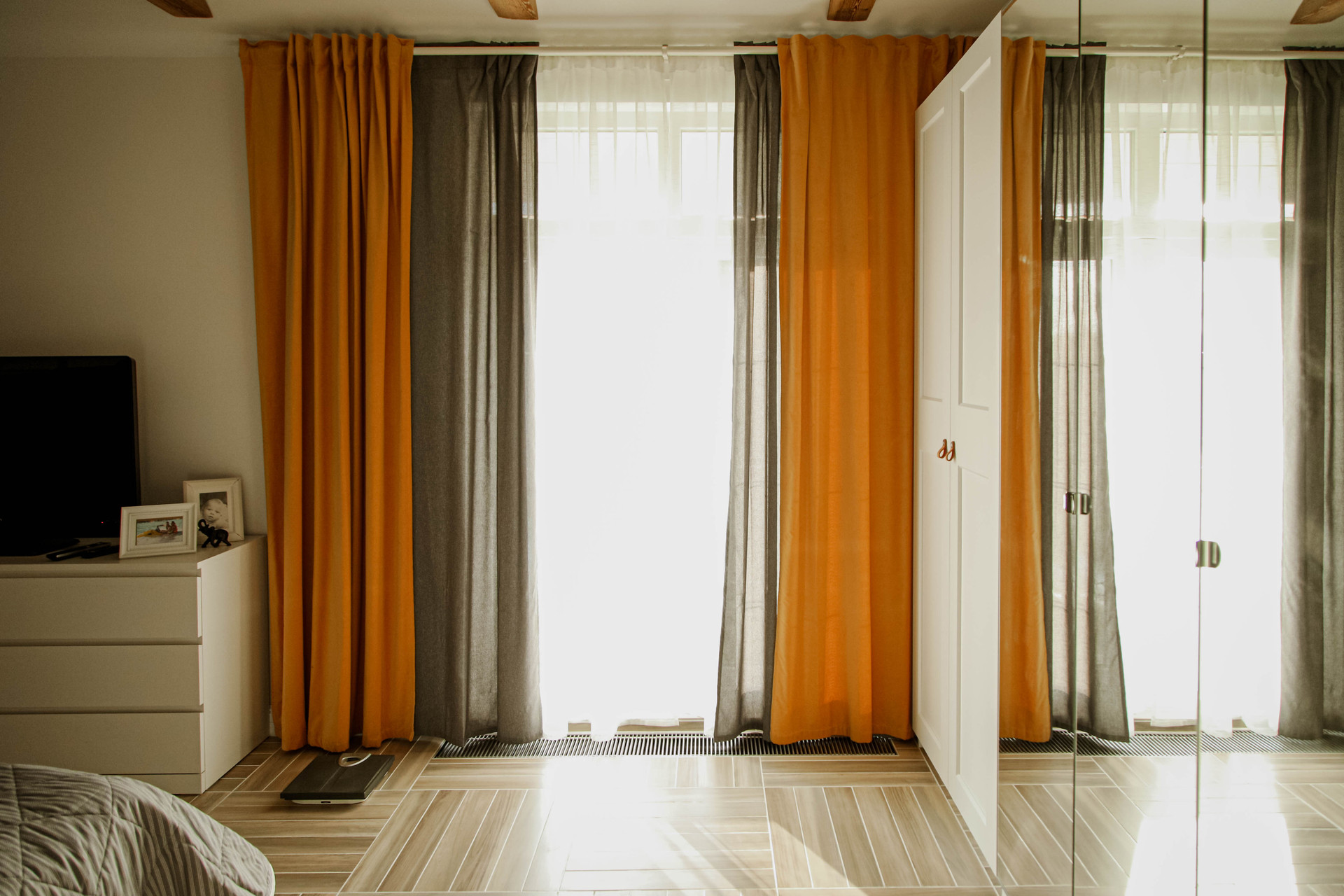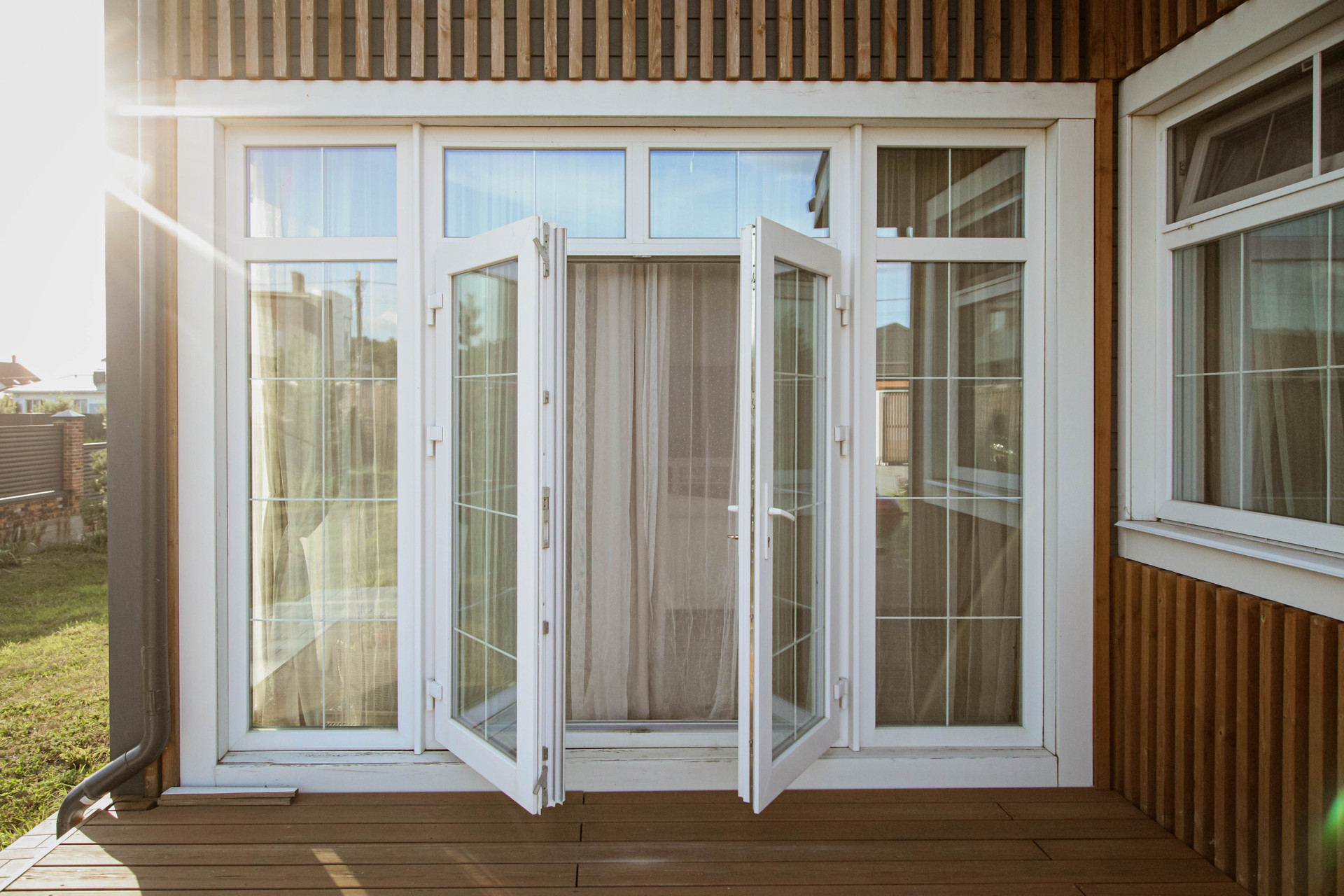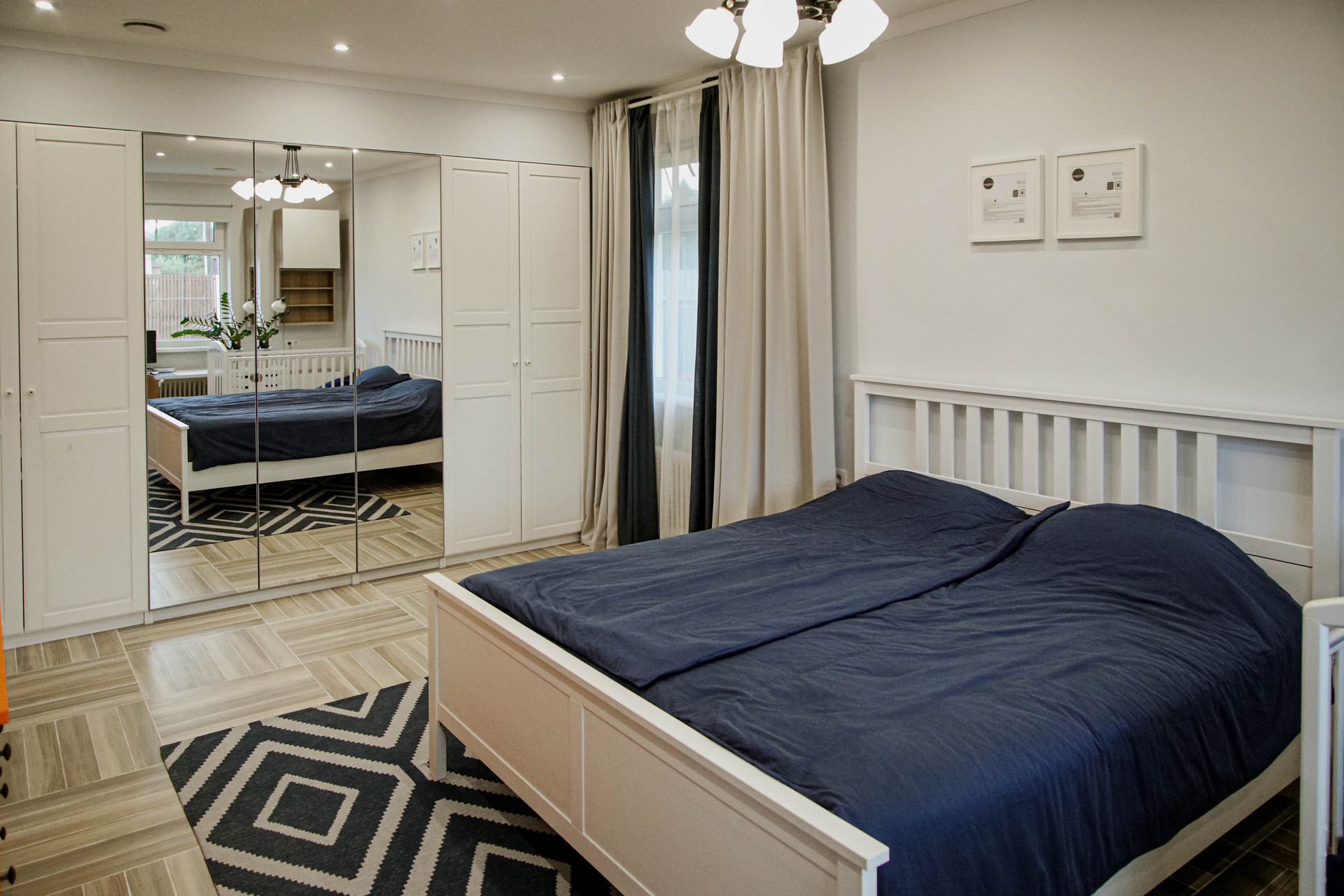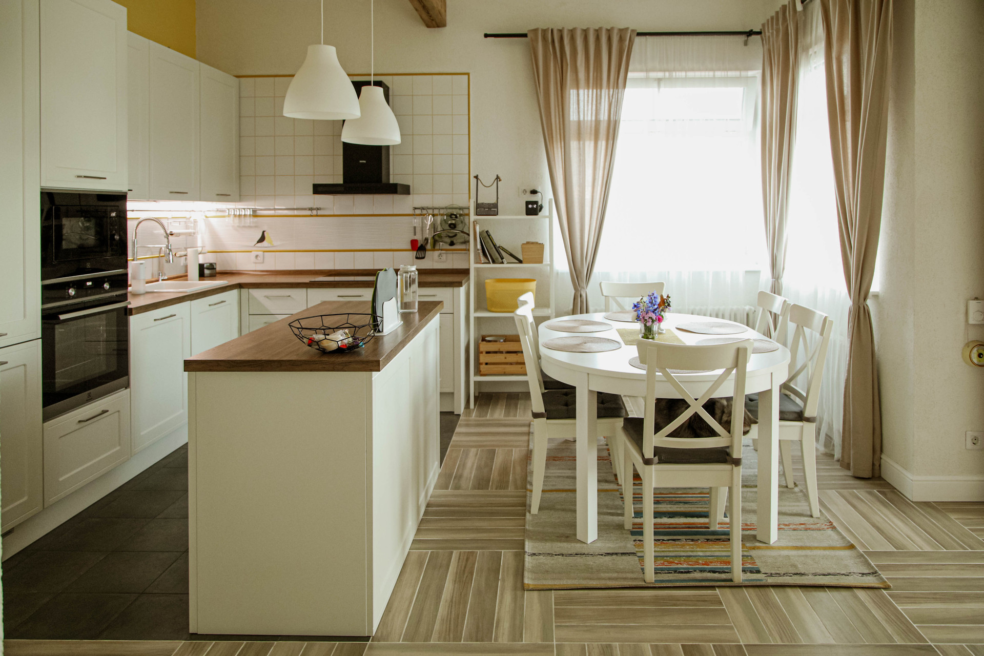 Гарнитур от Кухни-Мария оборудован топовой техникой: два холодильника, дополнительный морозильник, вместительная посудомоечная машина, индукционная плита, СВЧ. Большие окна открывают потрясающие виды, а через распашные французские двери можно выйти на террасу прямо из гостиной или спальни.