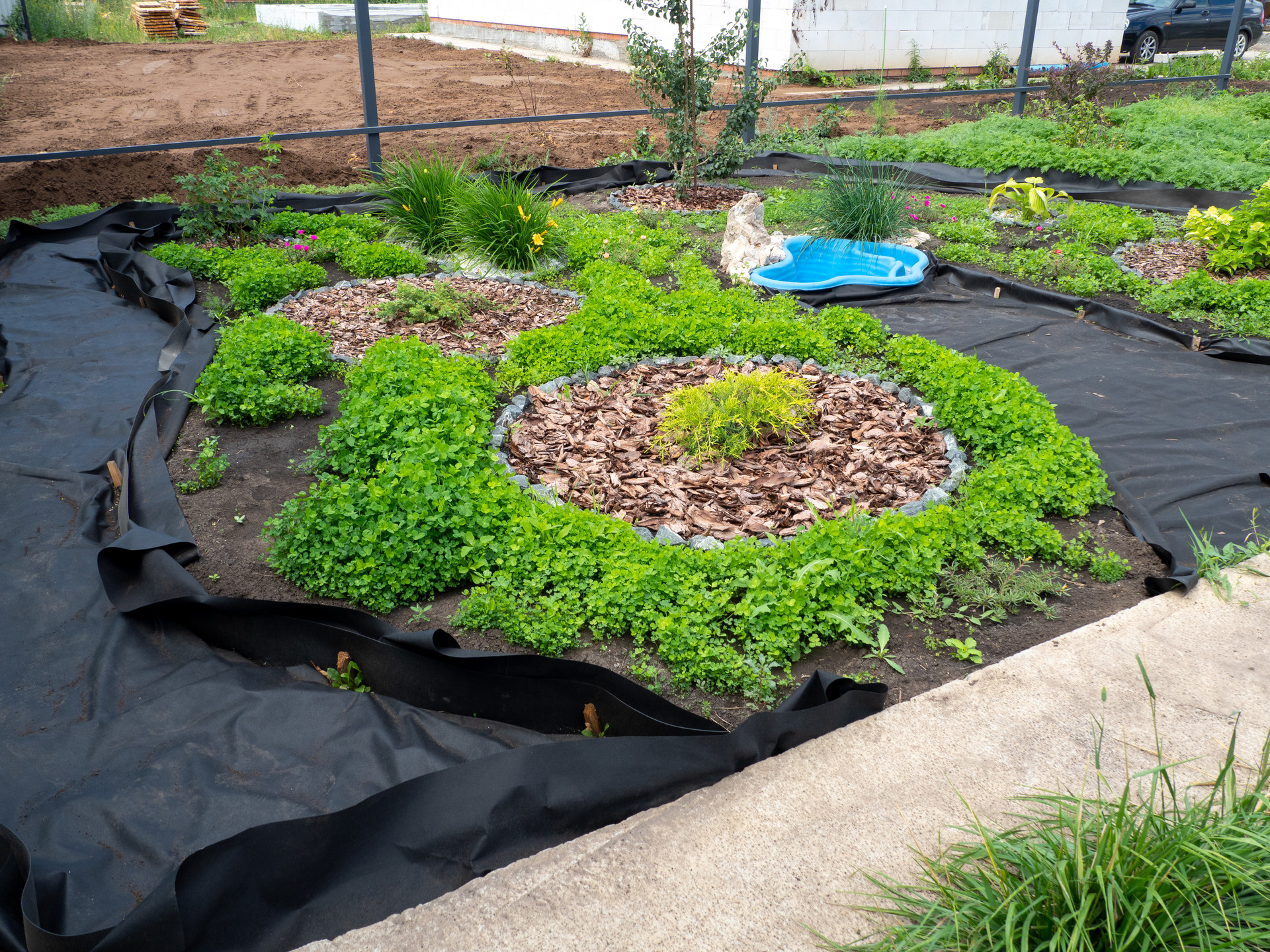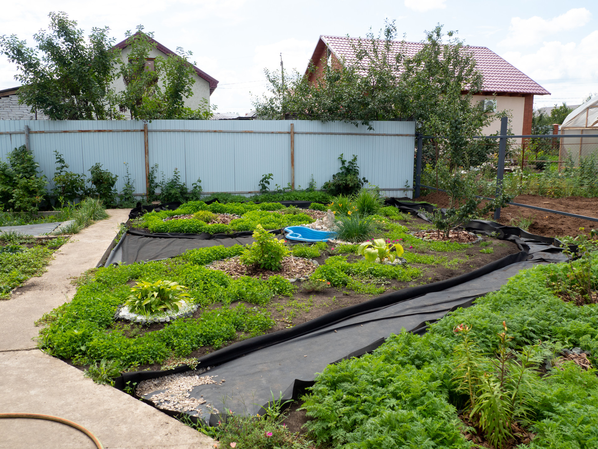 На участке ремонтантная клубника (плодоносит до декабря), малина, отпугивающее комаров и мошек растение, цветы, хвойные деревья и кустарники. Есть декоративный пруд.