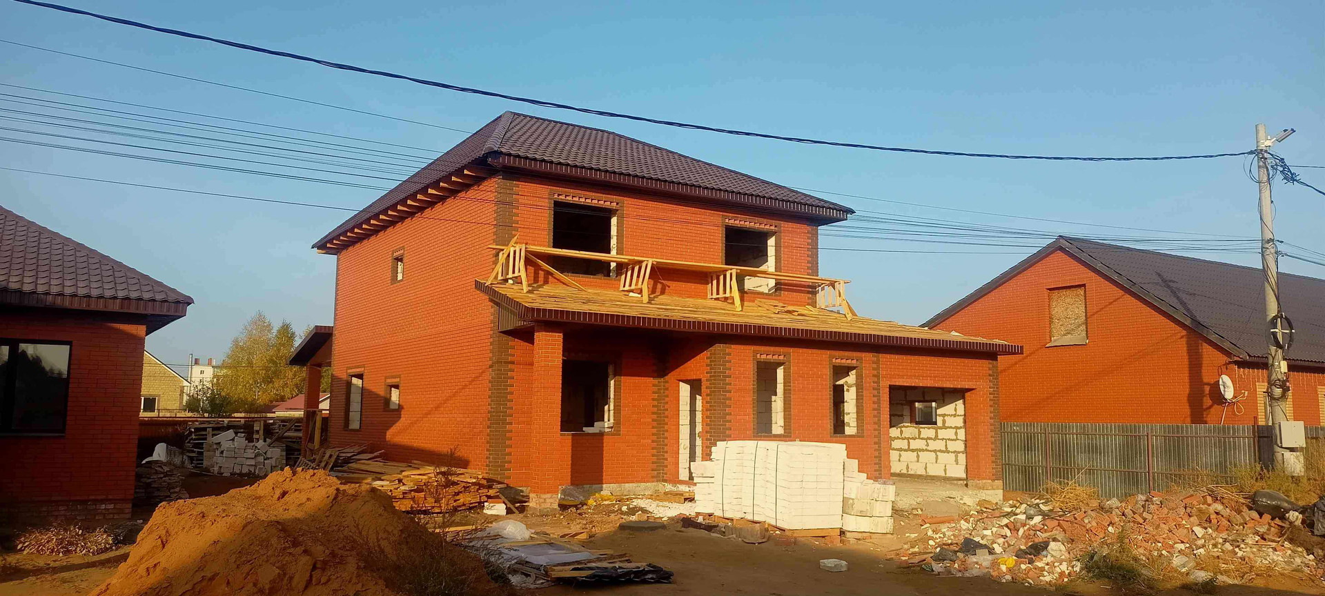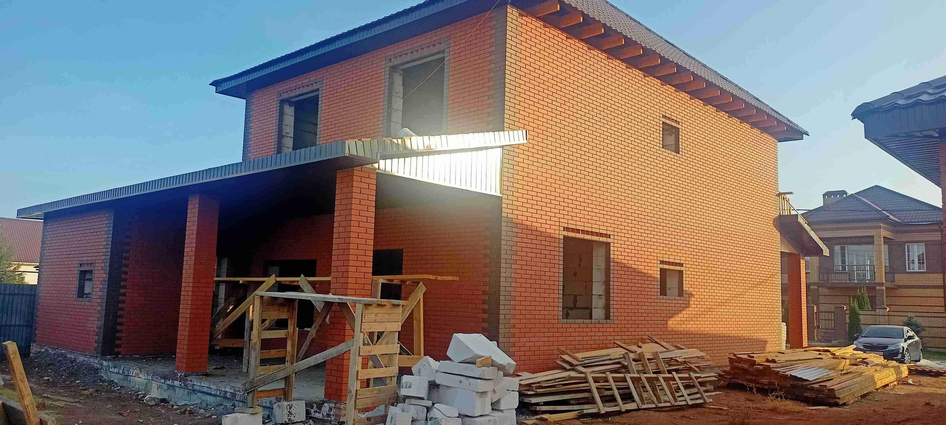 Дом строился для себя из качественных материалов: цельной газоблок  30-ка "Коттедж"+облицовочный кирпич. Фундамент свайно - ленточный. Перекрытие-ж/б плиты. Своя выгребная яма, проведены все канализационные трубы по дому.   Вода - своя скважина в доме. Электричество трехфазное. В доме будут установлены пластиковые окна с темной ламинацией  с теплоотражающим покрытием стекол.  В гараже будут установлены секционные автоматические ворота  фирмы " Алютех" в цвете шоколад