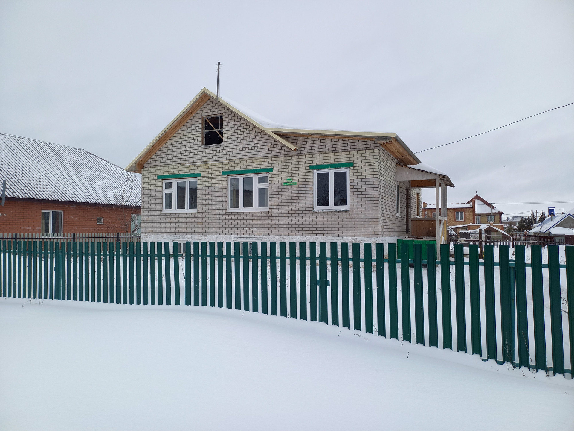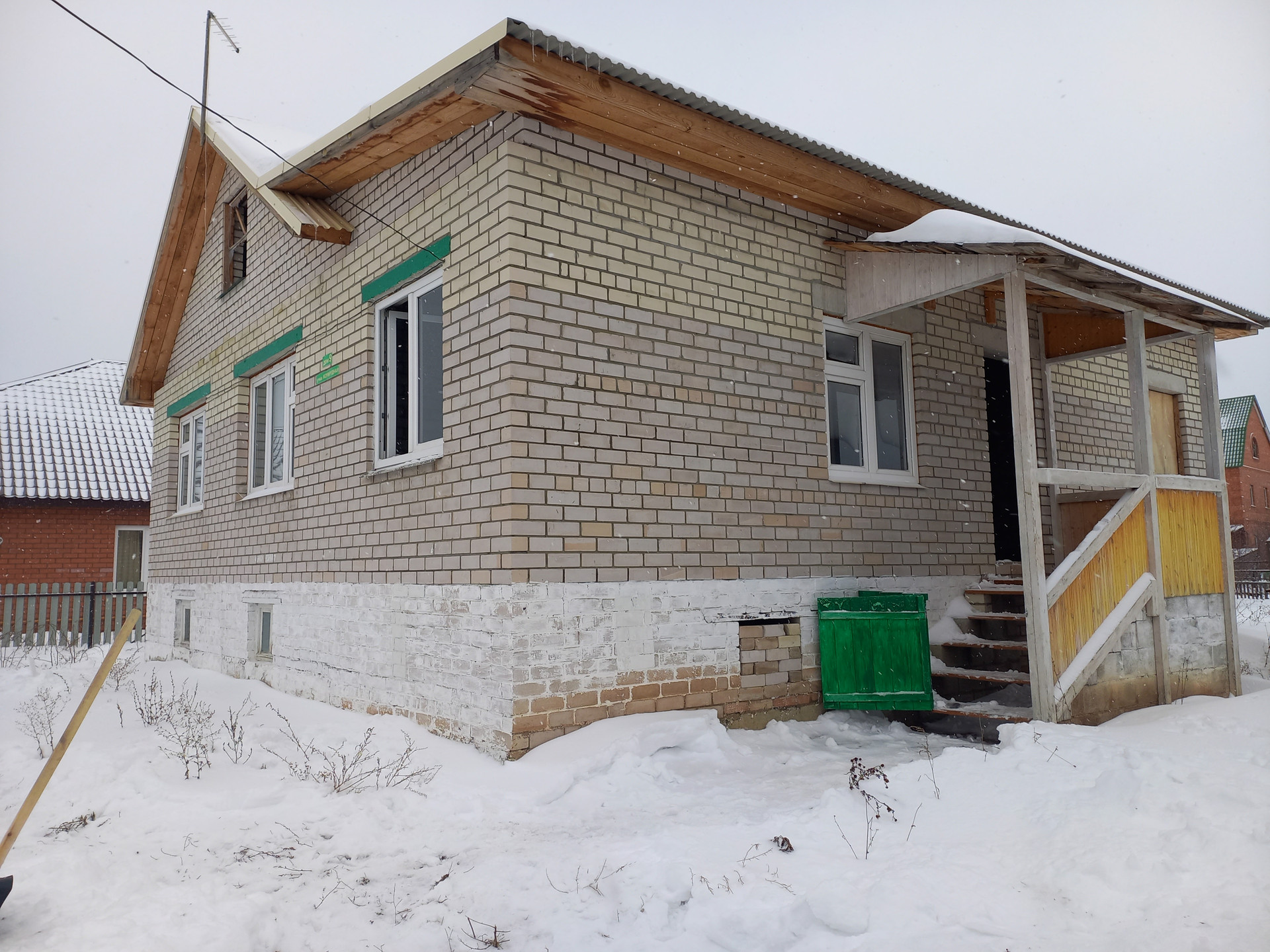 Добротный новый кирпичный дом с черновой отделкой и высоким цокольным этажом с окнами. На первом этаже три комнаты, кухня и санузел, на цокольном этаже 3 комнаты. Перекрытия бетонные, пластиковые стеклопакеты. С/у в доме. Электричество в дом заведено. Есть гараж на 1 машину. Хороший ровный участок. Улица тихая с коттеждной застройкой и хорошими соседями.