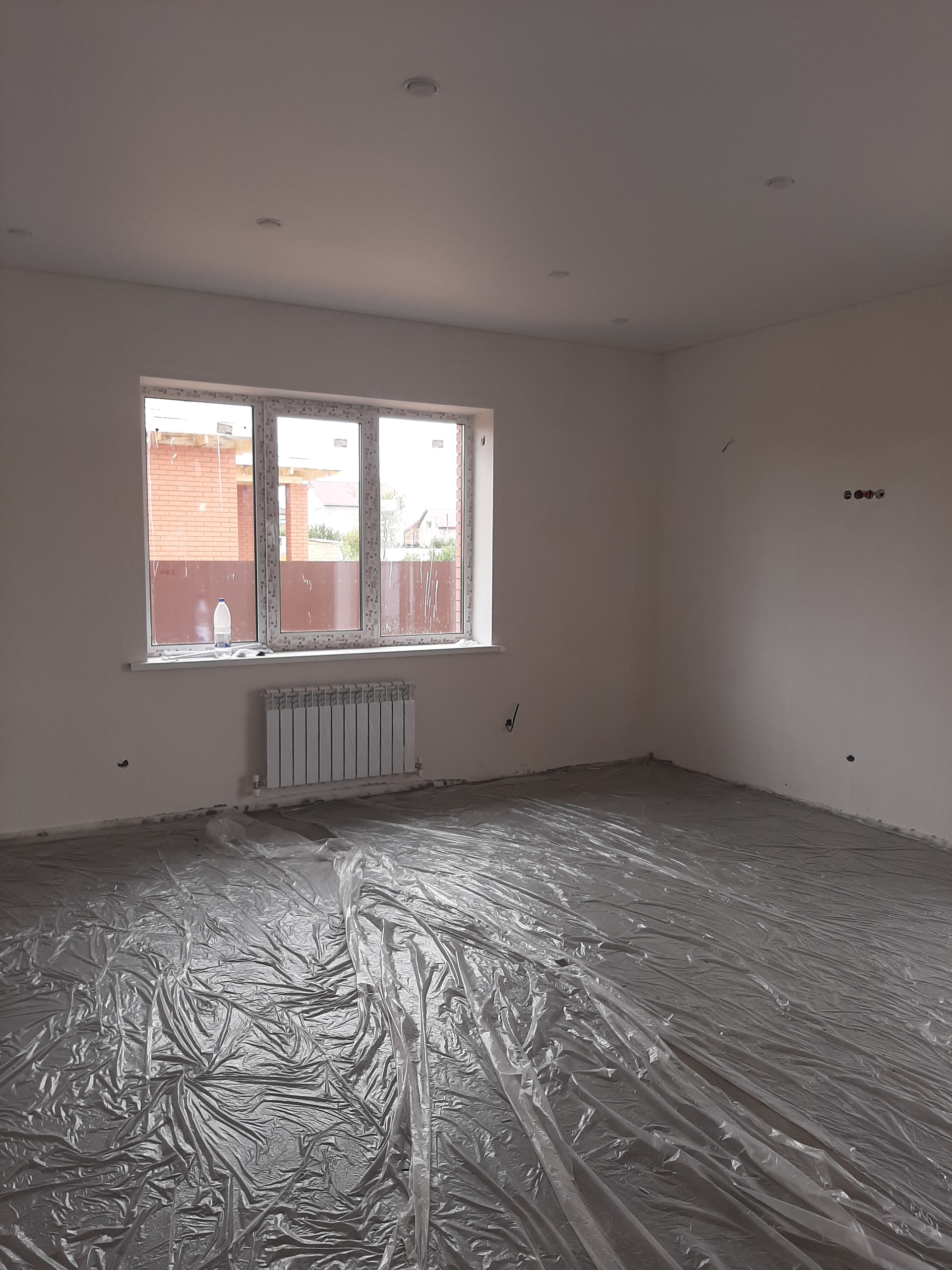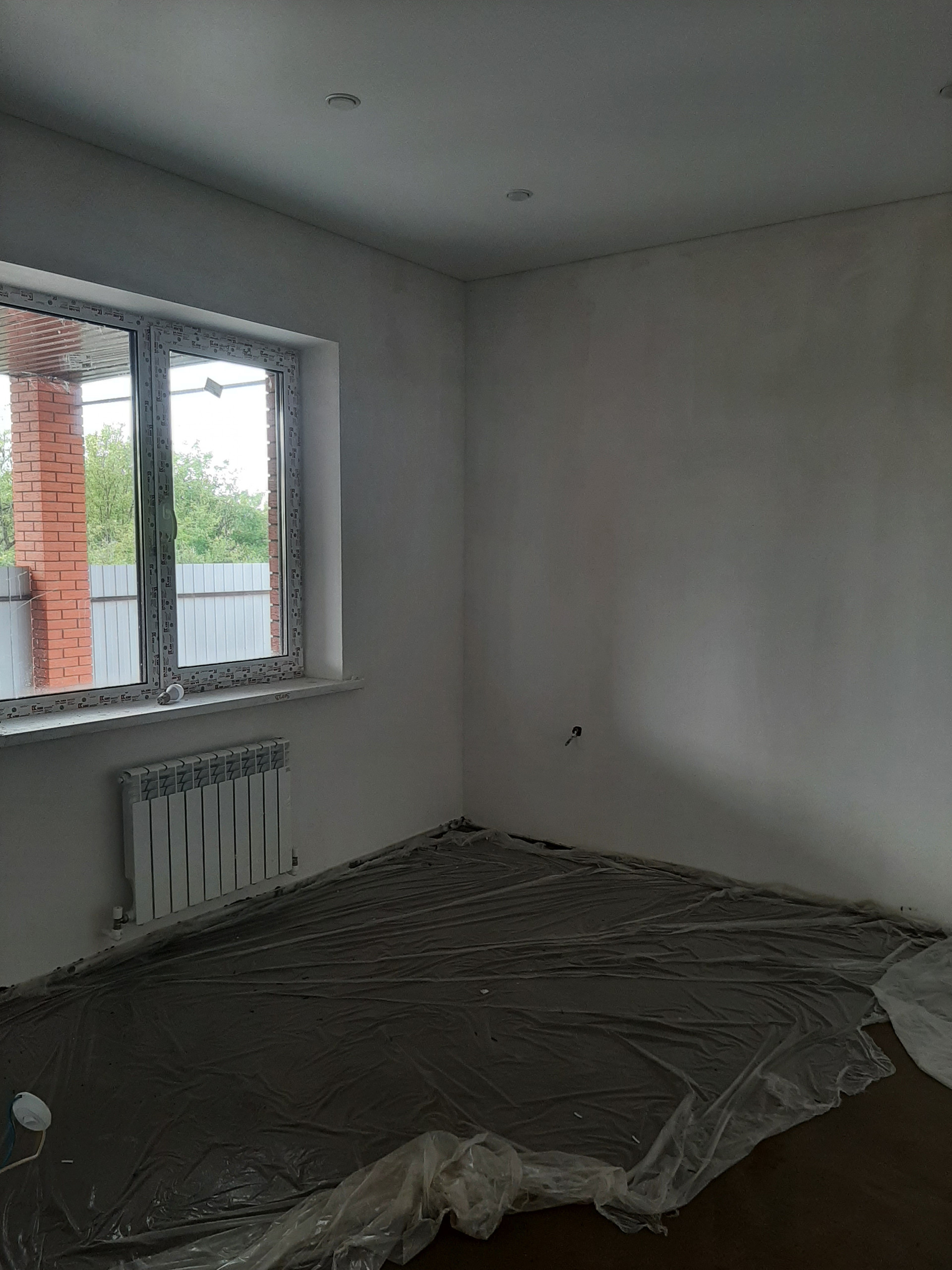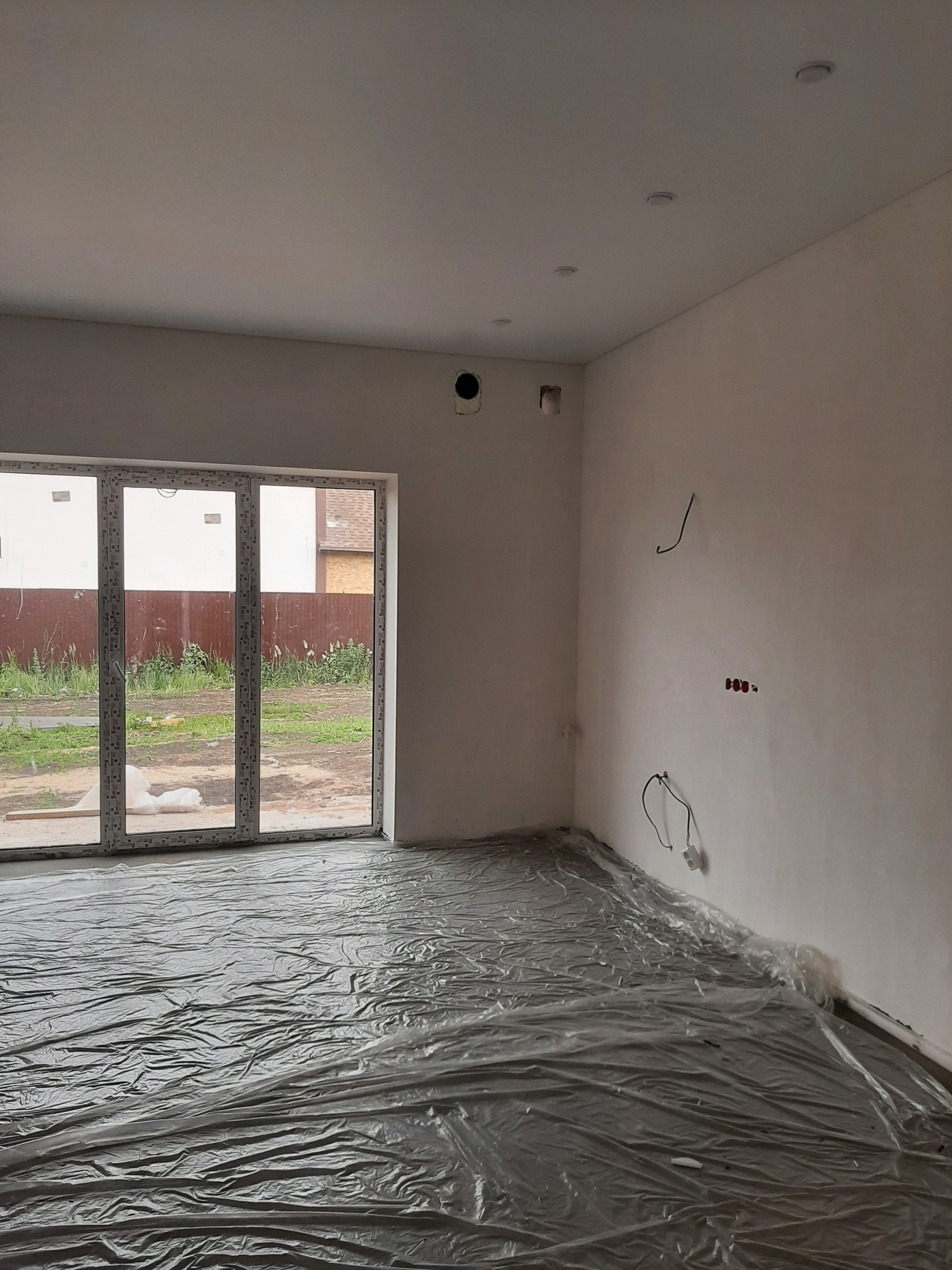 Стены внутри дома оштукатурены, готовы под оклейку обоями или покраску. Будут установлены натяжные потолки с точечным освещением.
